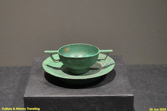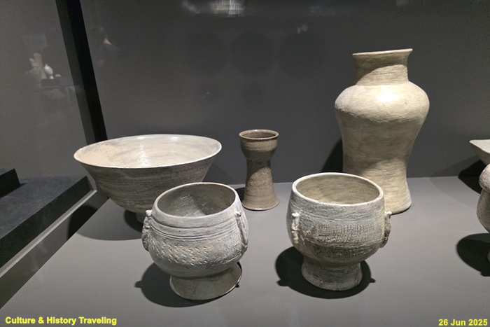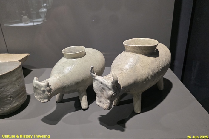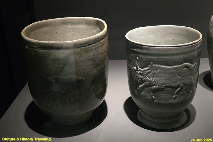 이 상준象尊과 희준犧尊은 술과 물을 담는 제기입니다. 상준은 몸체에 코끼리 무늬를 새겼고, 정화수와 제주의 일종인 흰 빛 도는 막걸리를 담았습니다. 희준은 소 무늬를 새겼고 정화와 단술를 담는데 사용되었습니다. 이 발형를 상준과 희준은 『세종실록』「오례」 길례 제기도설과 부합하는 형태로 만들어졌습니다. (안내문, 중앙박물관 특별전, 2025년)