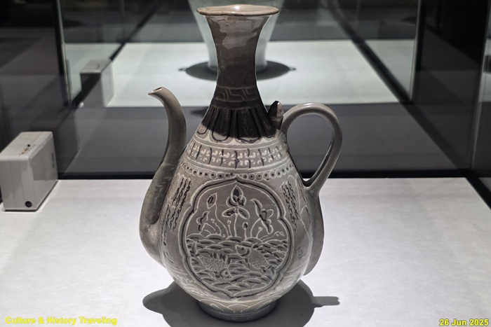 이 주자는 고려 말 14세기 상감청자 주자의 여운을 강하게 보여주면서 15세기 새로운 조형 요소를 받아들였습니다. 이 주자는 당시 금기金器로 제작되었던 『세종실록世宗實錄』「오례」 가례 준작조의 금봉병金鳳瓶, 『국조오례의서례」의 금대병金大瓶과 유사합니다. 대병은 이름은 병이지만 손잡이와 주구가 달린 병모양 주자입니다. 이 분청사기 주자는 백자와 더불어, 금속기를 대체하여 가례와 빈례에서 주기酒器, 다기茶器로 사용되었을 가능성이 있습니다. (안내문, 중앙박물관 특별전, 2025년)