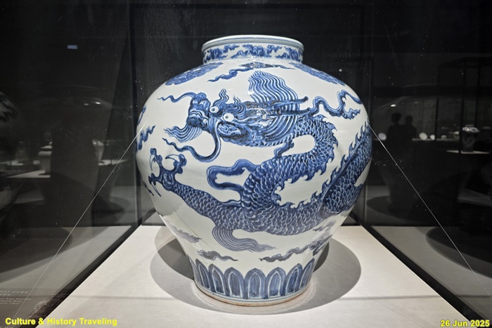 이 항아리는 입부분 바로 아래 ‘선덕년제’라고 쓰여 있어 명대 선덕년간(1426~1435)에 제작되었음을 알 수 있습니다. 1454년 간행된 『세종실록』「오례」 가례 준작조와 1474년에 간행된 『국조오례의서례』가례조에 도해되어 있는 ‘백자청화주해’와 생김새가 매우 유사하여 주목됩니다. 1430년(세종 12) 7월 명으로부터 ‘청화운룡백자주해’를 들여온 기록이 있어, 도설의 기물의 실존으로 유추할 수 있을 듯합니다. 조선 청화백자 용준이 제작되기 전 왕실 의례에서 사용하였던 것으로 보입니다. (안내문, 중앙박물관 특별전, 2025년)