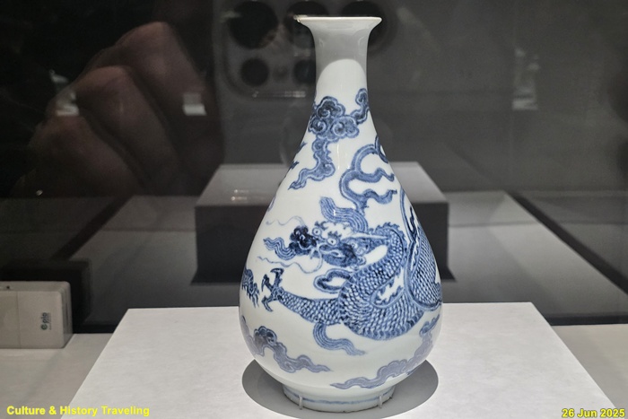 조선 전기 용이 그려진 백자는 많지 않습니다. 이 병은 옥호춘병의 형태에 몸체 가득 구름과 용을 그려 넣었습니다. 이데미츠미술관 소장 <‘선덕년제’宣德年製’가 쓰인 구름 용무늬 항아리>와 비교했을 때 용 무늬가 양식적으로 유사한데, 백자의 유색과 청화 안료의 발색이 뛰어납니다. 용 무늬가 그려진 것으로 보아 왕실에서 사용한 그릇으로 추정됩니다. 왕실 연례에서 주병酒瓶으로 사용되었을 가능성이 높습니다. (안내문, 중앙박물관 특별전, 2025년)
