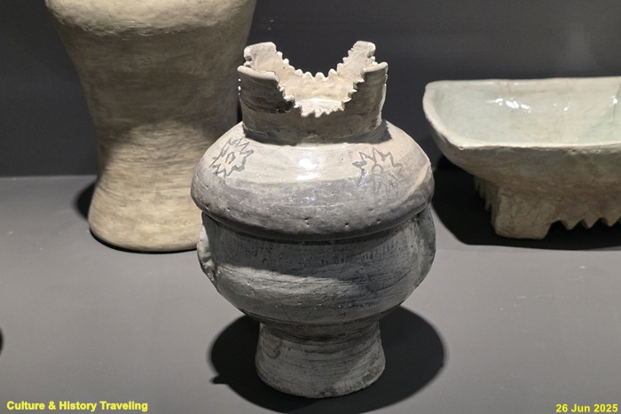 분청사기 착준과 황금 눈을 한 준모양 제기입니다. 착준은 양이 내려와서 땅에 부착된 것을 형상화한 것으로, 가을 제사와 겨울 제사에 사용되었다고 합니다. 몸체에 황금 눈을 새긴 준모양 제기는 조선의 제기도설에는 동일한 모습이 확인되지 않습니다. 『세종실록』「오례」 길례 제기도설에 황금 눈이 그려진 발鉢 형태가 수록된 바 있습니다. 조선에 중국의 여러 예서가 수용되었고 이를 조선의 유교 예제에 맞게 정리하는 과정을 보여줍니다. (안내문, 중앙박물관 특별전, 2025년)