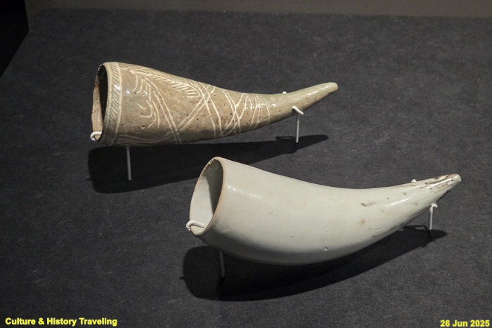 상감백자, 청동 그리고 백자로 제작된 손잡이 달린 잔입니다. 손잡이가 달린 잔은 『세종실록』「오례」 가례 준작조에 있는 ‘쌍이청옥잔’, ‘쌍이운록청옥잔’ 등과 형태가 같습니다. 손잡이가 달린 백자잔은 중앙에서는 가례나 빈례 등 궁중 연향용 의례기로 사용되고 지방에서는 길례적 성격의 제기로 사용되었을 가능성이 높습니다. 뿔 모양의 술잔은 『세종실록』「오례」 군례 및 『국조오례의서례』 군례 사기도설에서 ‘치觶’라고 지칭되었습니다. 활쏘기의 승부에서 진 사람을 위한 벌주잔으로 사용되었습니다. (안내문, 중앙박물관 특별전, 2025년)