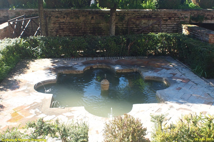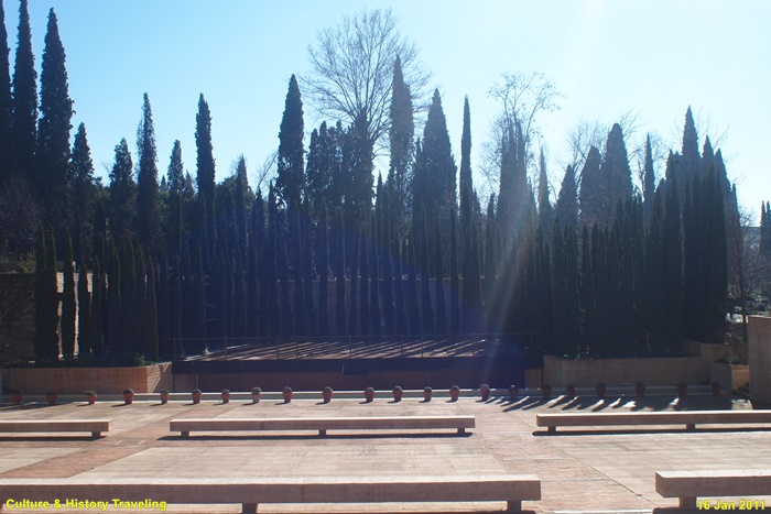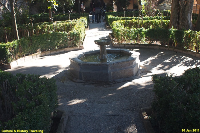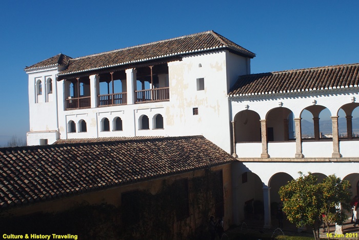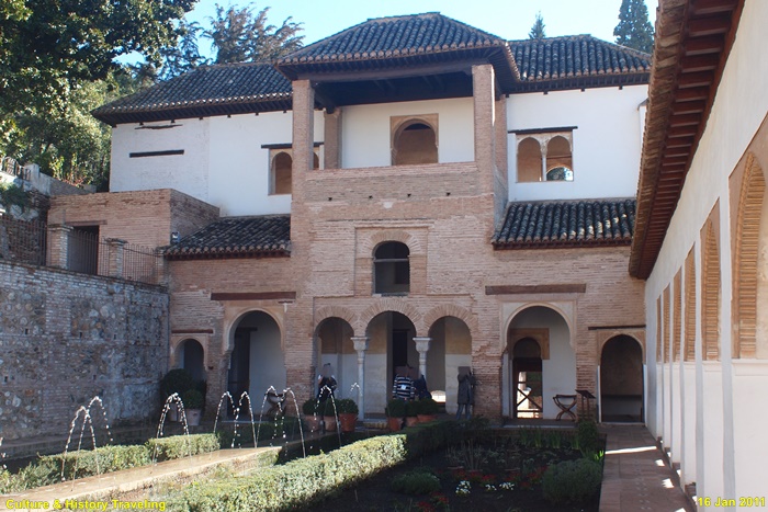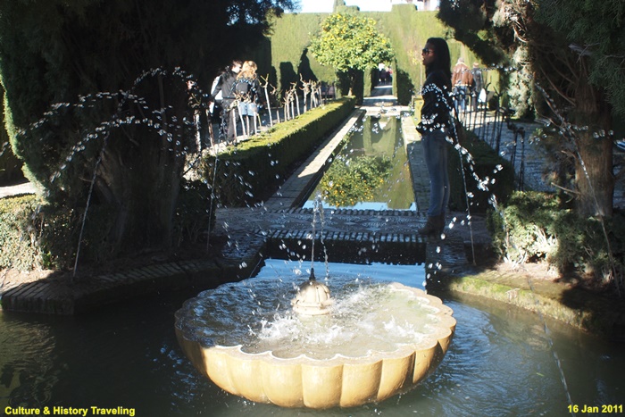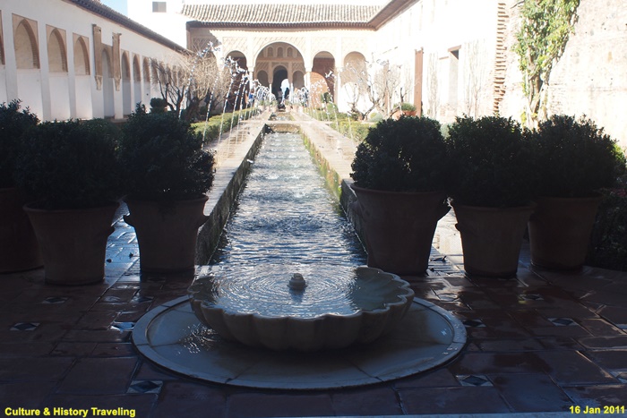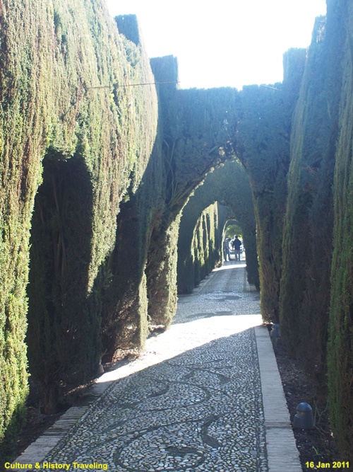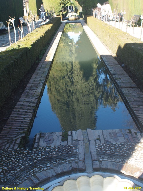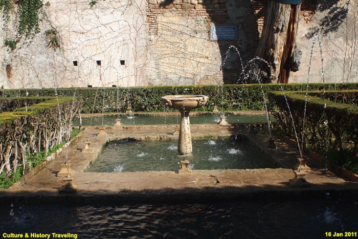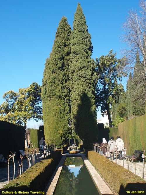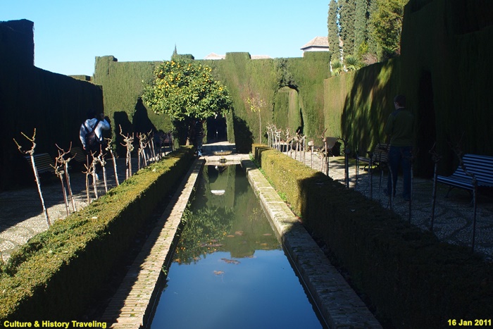 스페인 그라나다 알함브라에 있는 헤네랄리페(Generalife) 이다. 스페인을 통치하던 아랍의 나스르 왕조 시절인 13세기 말에 지어졌다. 헤네랄리페는 이슬람 통치자들의 여름 궁전이었던 곳으로 ‘건축가의 정원’ 이라는 뜻이다. 알람브라 동쪽 오르막길에 위치해 있으며 아름다운 정원과 수로, 테라스로 유명하다. 나스르 왕조시절에는 왕족을 위한 휴양지이기는 했자만 정원 과수원, 말의 목초지, 채소른 기르는 밭으로 사용되었던 것으로 추정하고 있다. 16세기에 카톡릭 군주는 파빌리온 위층을 추가하는 등 재설계하였으며 19세기 이후 원래의 구조를 참조하여 오늘날과 같은 모습을 갖추게 되었다. 정원의 수목들은 19세기 이후 사람들의 취향에 맞게 심어졌다고 한다.