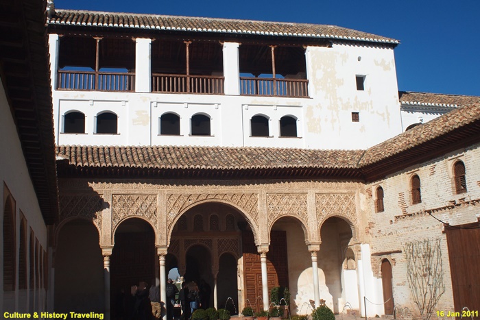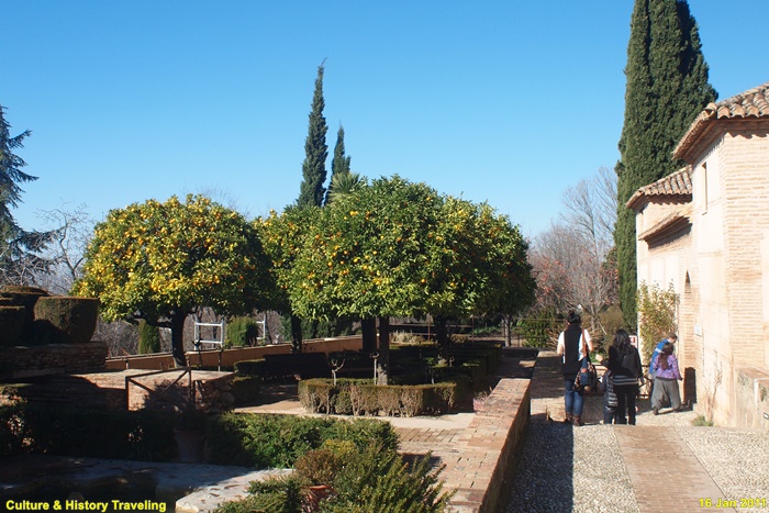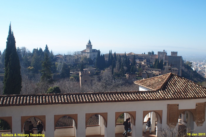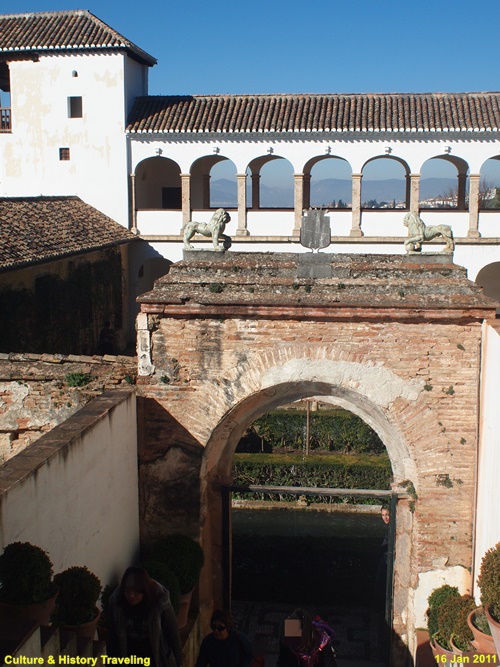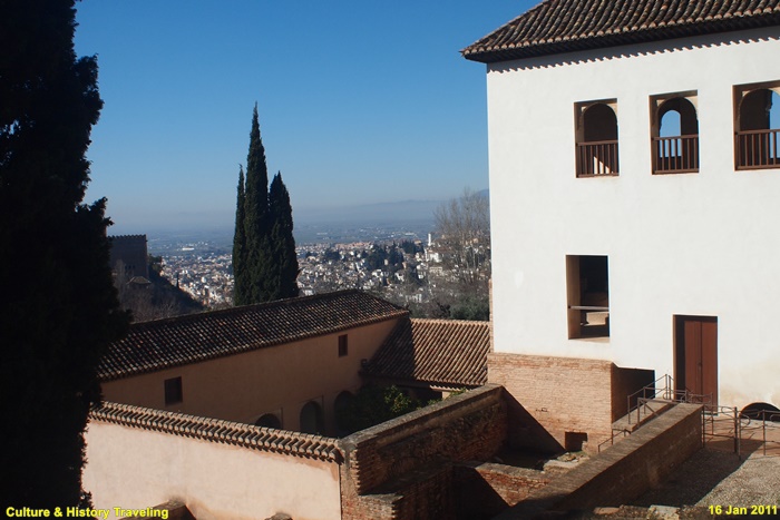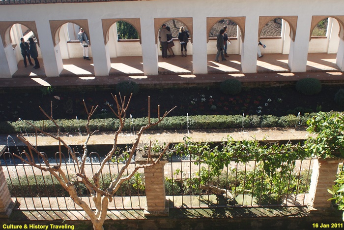 정원 서쪽 통로로 사용되는 회랑은 나스르 궁전과 그라나다 도심을 향해 개방되어 있어 전망대 역할도 하고 있다.