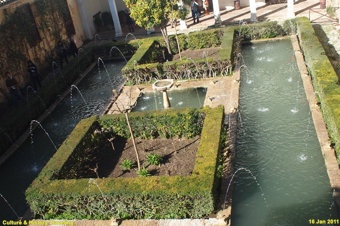 수로의 양 끝에는 아치가 있는 파빌리온이 있다. 전망이 좋은 북쪽 파빌리온은 왕의 거처로 연결되며, 입구 파빌리온은 수행원들의 방으로 연결된다. 남쪽 파빌리온은 작은 안뜰(Patio de Polo)를 통해 외부로 연결된다.