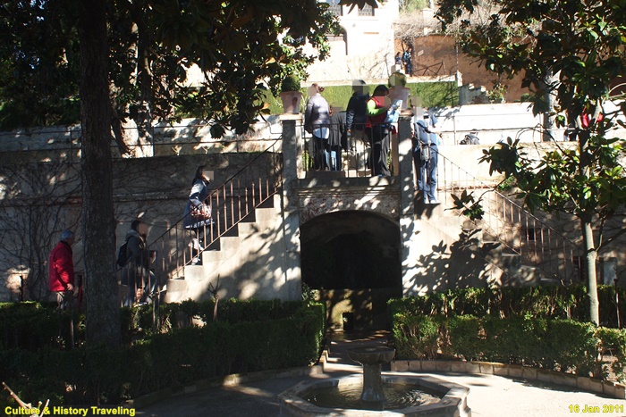 ‘술타나의 삼나무 안뜰’ 위쪽에는 유명한 ‘물 계단(Escalera del Agua)’이 있다. 이름처럼 계단을 따라 양쪽 난간에서 물이 흐르는 구조를 가진 독특한 조경 요소이다. 계단은 4단으로 이루어져 있으며, 양쪽 난간에는 물길이 조각되어 있고, 계단 꼭대기와 계단 전체를 따라 물이 흐른다. 각 층에는 작은 테라스가 있으며, 테라스 중앙에는 분수가 있다.