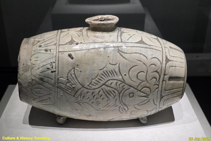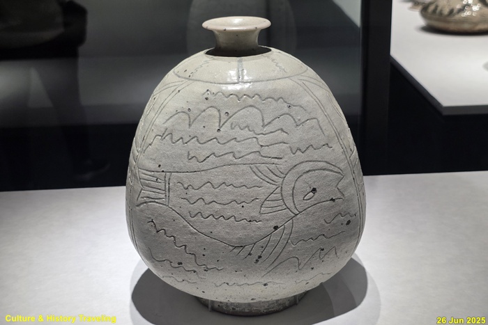 옆면은 곡선과 직선으로 음각했고, 앞면과 뒷면에는 물결 속에 뒤집혀진 물고기를 표현했다. 마치 어린아이가 그린 듯 해학적이다. 그릇 표면에 보이는 검은 점은 유약의 철 성분이 굽는 과정에서 자연스레 나타난 것이지만 마치 무늬를 넣은 것 같은 효과를 낸다.