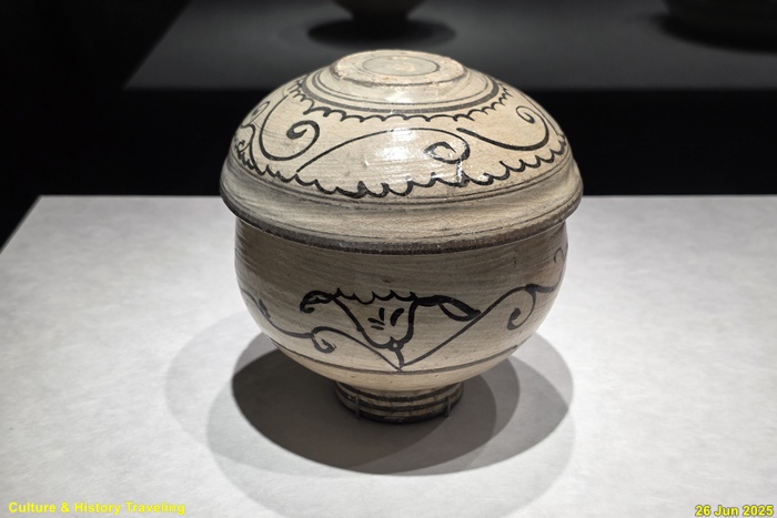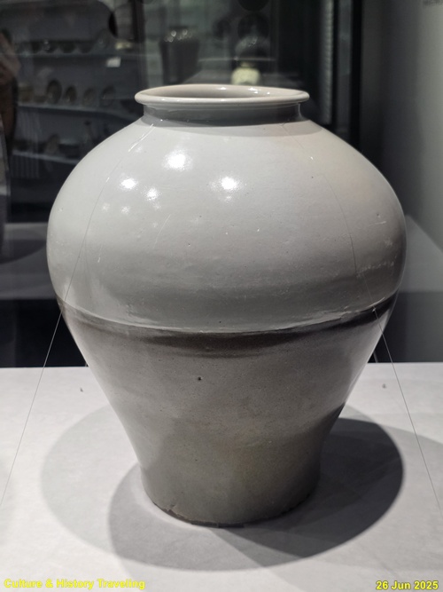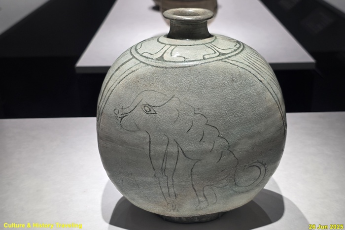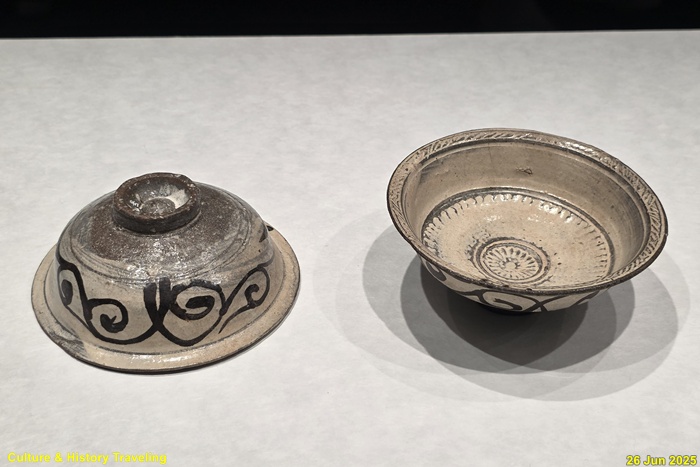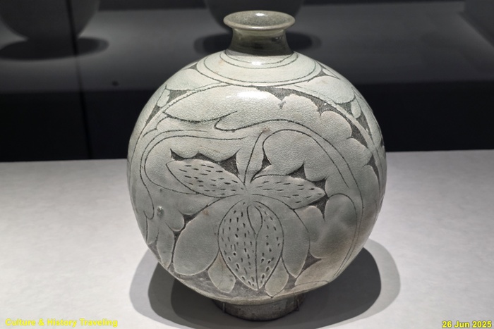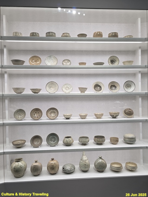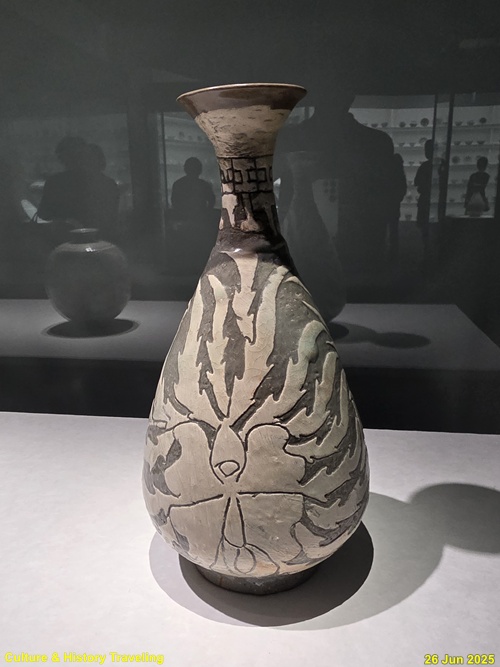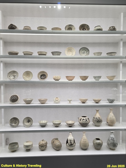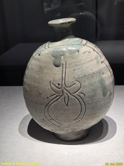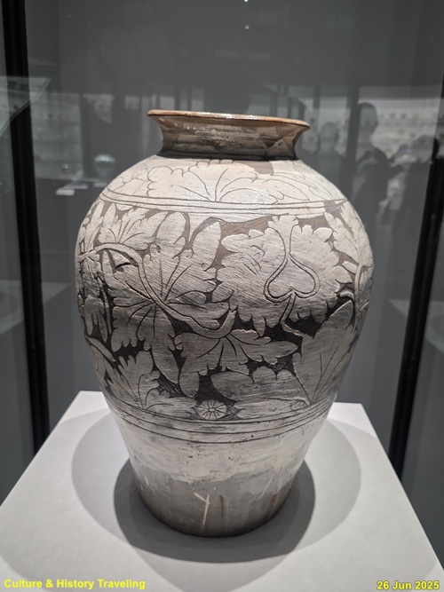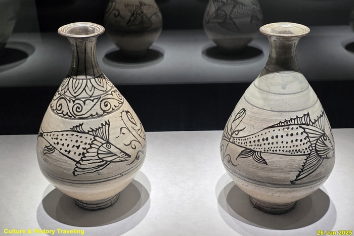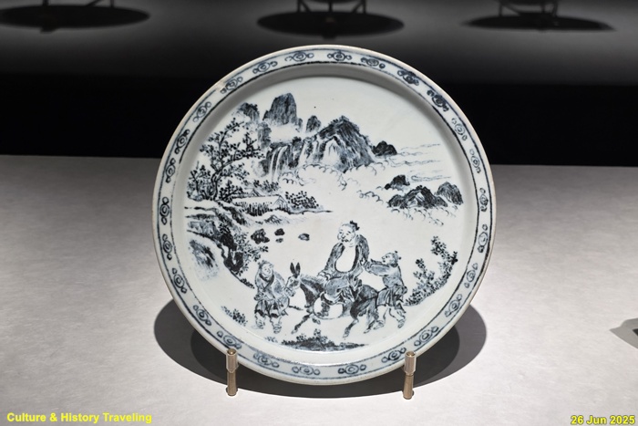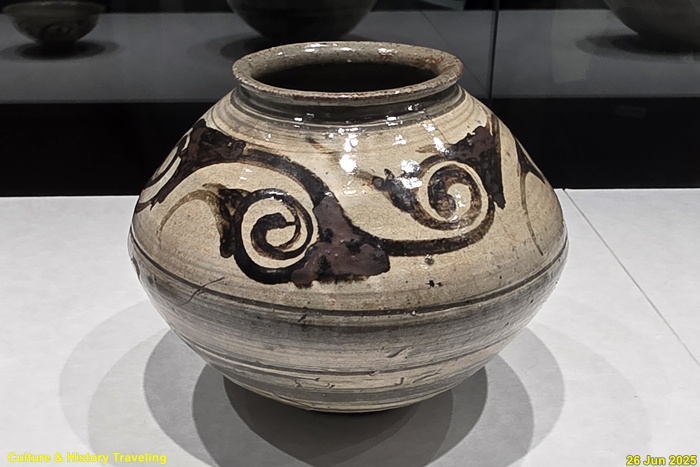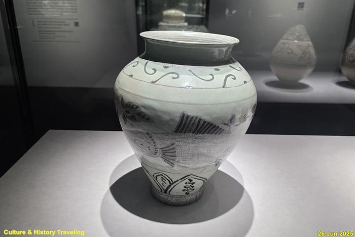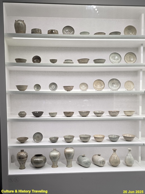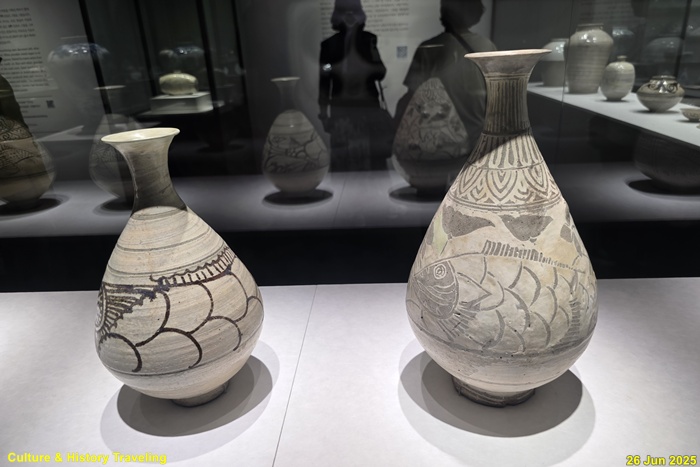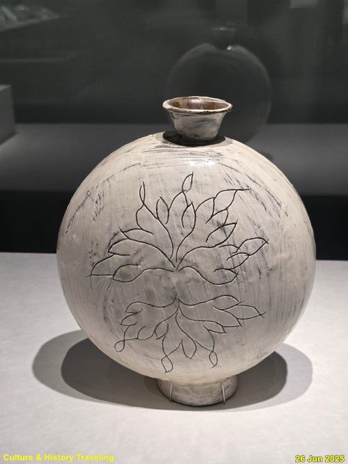 조선 전기에는 하얀 문양을 찍은 분청사기와 하얀 바탕을 이뤄낸 백자가 함께 만들어졌습니다. 순백의 백자 표면에는 파란 청화 안료로 그림을 그렸습니다. 왕실 도화서 화원들이 그린 청화백자의 무늬는 조선 왕실의 이상과 품격을 보여줍니다. 분청사기에는 백토 바탕에 검은 철 안료로 그림을 그려 넣거나 칼로 무늬를 새겼습니다. 지역 장인들이 만든 분청사기는 자유로운 기운과 생명력을 담고 있었습니다. 새 나라가 출발한 지 어느덧 200여 년이 흘러 백색의 그릇은 조선 사람들의 삶에 완전히 자리 잡았습니다. (안내문, 중앙박물관 특별전, 2025년)