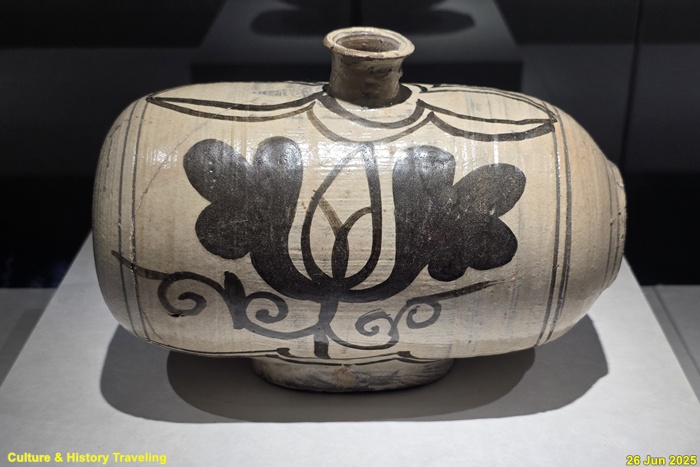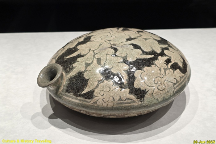 <분청사기 박지철채모란문 자라병>(국보)은 분청사기를 대표하는 작품 중 하나로 15~16세기에 만들어졌다. 납작한 몸체에 주둥이가 달린 형태로 자라를 닮아 ‘자라병’이라 불리는 이병은 실생활에 여행용 물병이나 술병으로 사용된 것으로 보인다. 조형성이 뛰어나며 흑백의 대조가 멋스러운 작품이다.