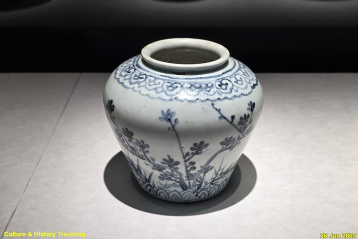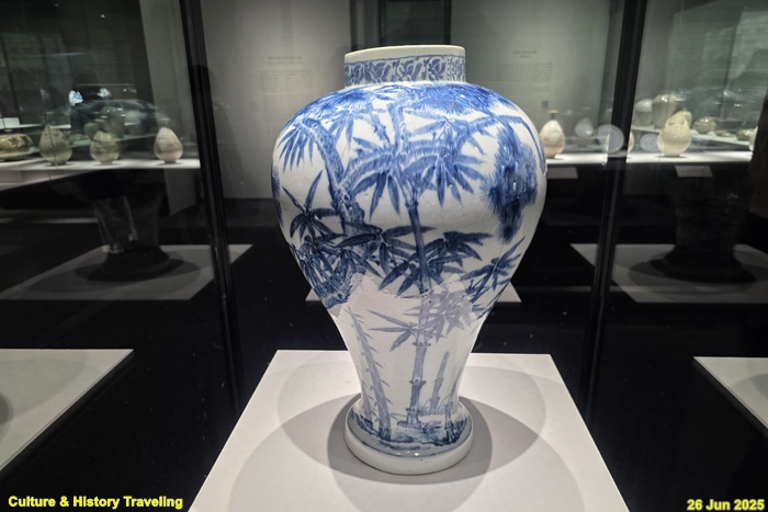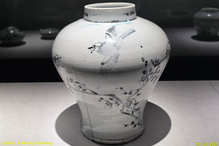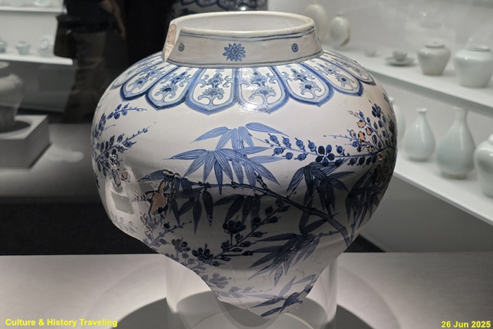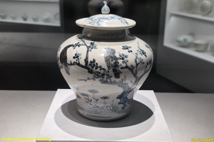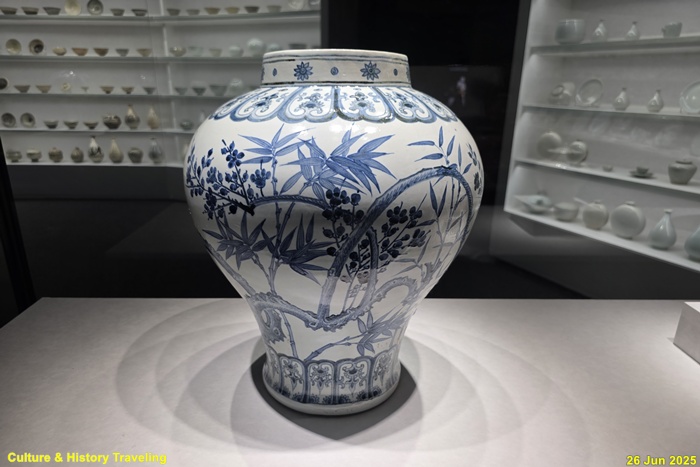 <백자 청화매조죽문 유개항아리>(국보)이다. 조선전기를 대표하는 청화백자로 격조높은 그림이 그려져 있는 항아리이다. 몸통의 어깨는 벌어졌으며 허리는 잘록하게 만들어 바닥에서 도드라지는 느낌을 준다. 뚜껑 손잡이에 꽃잎 4장을 그리고 그 주위에 매화와 대나무를 그렸다. 몸체의 한면에는 한쌍의 새가 앉아 있는 매화와 들국화를, 다른 면에는 대나무를 그렸다. 문양의 배치나 그림 수법 등에서 명나라 청화백자의 영향을 받은 것으로 보이며 도화서 화원이 직접 그린 격조높은 그림으로 추정하고 있다.