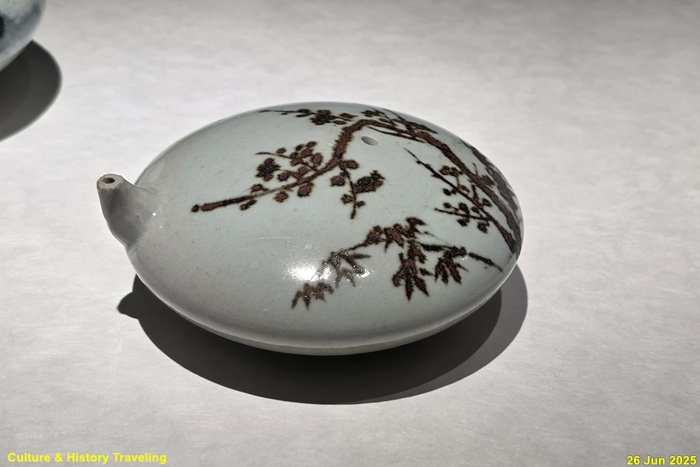 관요에서 눈처럼 희고 단단한 경질백자가 완성되자 이를 바탕으로 청화백자가 만들어졌습니다. 청화백자는 코발트 안료로 그림을 그려 백색 바탕에 청색 그림으로 나타납니다. 조선 전기 청화백자의 그림은 왕실 도화서의 화원이 그렸습니다. 그림의 소재는 주로 소나무 ·대나무·매화의 세한삼우, 보상화 넝쿨과 인물, 물고기였고, 시가 쓰이기도 했습니다. 외래적 요소를 가지고 출발하지만 수요층인 왕실의 정신과 미감을 담아 정제된 표현으로 조선의 특색을 갖추어 갑니다. 철화백자는 청화백자와 유사한 소재를 그렸는데, 백색 바탕에 검은 발색의 대비가 수묵화를 연상시킵니다. 조선 전기 청화백자·철화백자의 문양은 새 나라를 세운 이들의 문인적 취향과 군자적 지향의 함의와 풍류를 담았습니다. (안내문, 중앙박물관 특별전, 2025년)