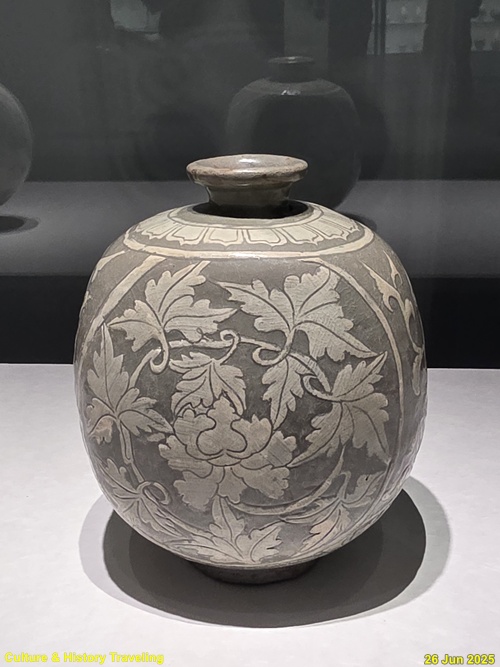흰색 모란 넝쿨무늬와 회흑색 바탕이 선명하게 대비를 이루었다. 특히 거친 붓질 흔적에서 분청사기 특유의 질감이 느껴진다.