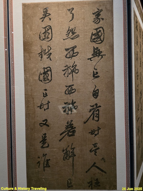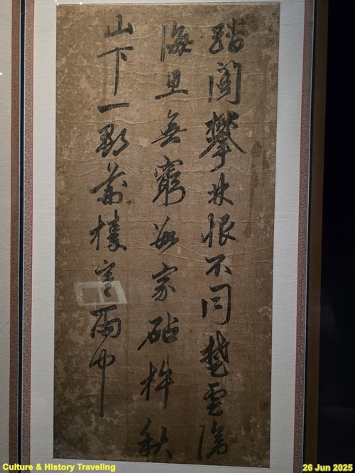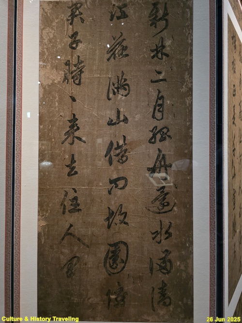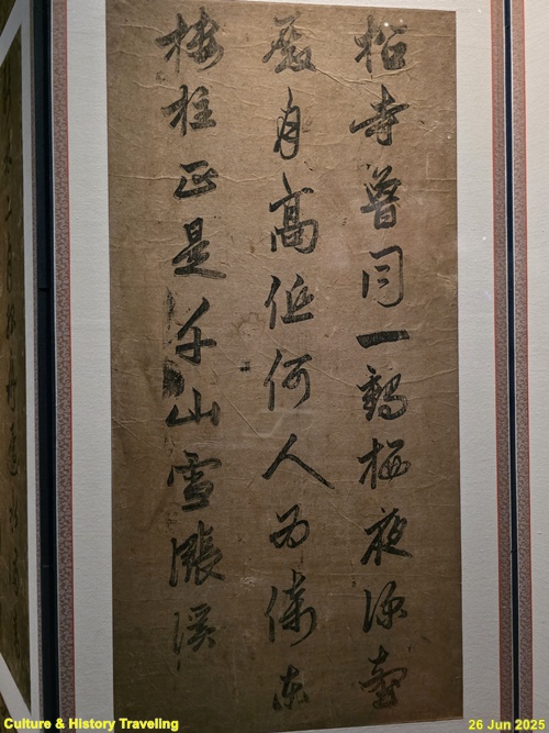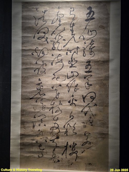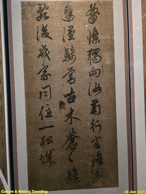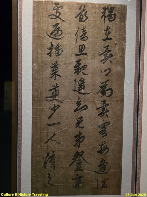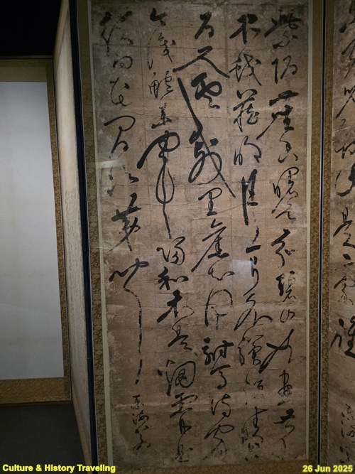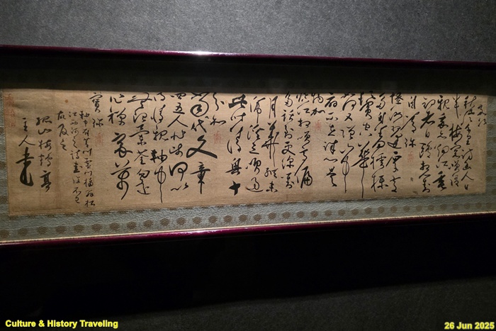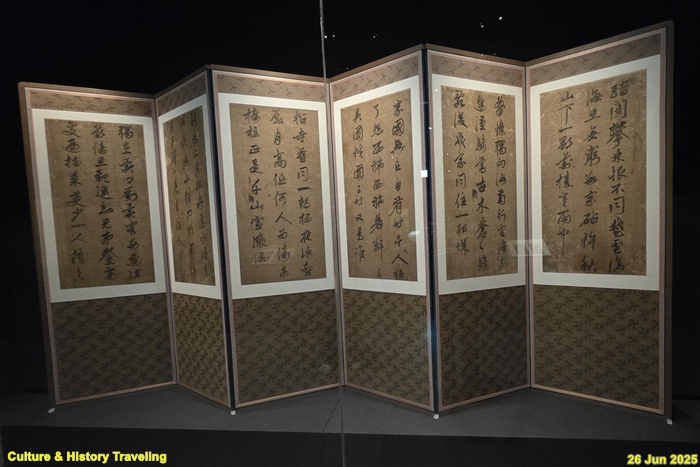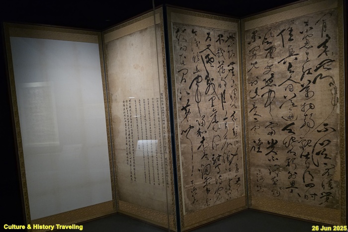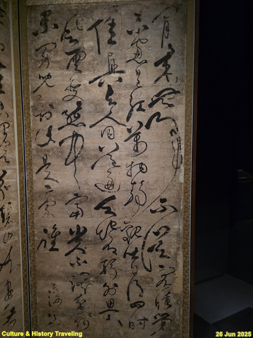 16세기 전반, 중국 명나라 서예가 장필의 글씨가 조선에 전해졌다는 것을 보여주는 귀한 초서 작품입니다. 이 병풍은 문신 충재 권벌이 사행시에 북경에서 구입한 것입니다. 획마다 움직임이 강하고, 화면 전체에 리듬감과 생동감이 살아 있습니다. 이런 장필의 초서는 조선 서예에 큰 영향을 주었습니다. 자암 김구, 고산 황기로 등과 같은 16세기 대표적인 초서 명필들이 장필의 필법을 바탕으로 자신만의 서풍을 발전시켰습니다. (안내문, 중앙박물관 특별전, 2025년)