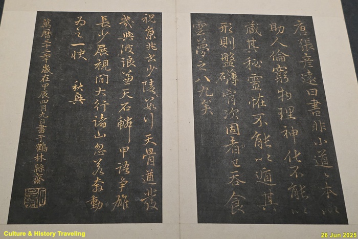 안평대군 이용이 역대 명필들의 글씨를 모아 만든 첩입니다. 특히 통일신라 시대의 명필 김생의 글씨가 포함된 점이 눈에 뜁니다. 또 조맹부의 시문도 많이 실려 있는데, 이는 안평대군이 조맹부의 서체를 무척 좋아했기 때문입니다. 이 첩은 1443년에 처음 만들어졌고, 1450년(문종 즉위년) 11월에는 교서관에서 찍은 판본이 왕에게 올려지기도 했습니다. 여러 시대의 명필 글씨를 한눈에 볼 수 있도록 엮은 이 첩은 조선시대 최초의 법첩으로서 아주 특별한 의미를 지닙니다. (안내문, 중앙박물관 특별전, 2025년)
