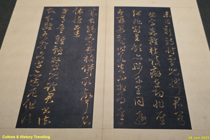 조선을 대표하는 명필 석봉 한호의 노년 글씨로, 모두 세 첩으로 이루어져 있습니다. 첫 번째와 두 번째 첩에는 한호가 가평군수에서 물러난 1602년부터 흡곡현령으로 있었던 1604년 사이에 쓴 글씨가 실려 있습니다. 검은색이나 감색 종이에 금니로 글씨를 썼으며, 해서·행서·초서의 다양한 서체를 사용했습니다. 세 번째 첩은 흰 종이에 검은 먹으로 도교 경전인 「설상청정경説常清淨經」을 정갈하게 옮겨 쓴 것입니다. 이 첩은 석봉체의 정수를 보여준다고 평가되며, 한호의 깊은 서예 세계를 가장 잘 드러내는 대표작으로 꼽힙니다. (안내문, 중앙박물관 특별전, 2025년)
