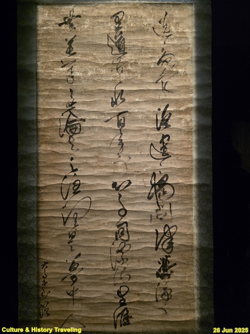 16세기를 대표하는 초서 명필 황기로가 쓴 작품입니다. 황기로는 당나라의 초서 명필 장욱과 회소의 전통을 바탕으로, 명나라 서예가 장필의 서풍을 더해 자신만의 독자적인 초서체를 완성 하였습니다. 이 작품은 마치 가느다란 실타래가 풀리듯 부드럽게 이어지는 붓의 흐름이 특징적입니다. 글씨의 선은 자연스럽고 여유로우며, 빠르면서도 안정감 있게 연결되어 있습니다. 단순한 흘림체를 넘어 움직임과 여백이 조화를 이루는 초서의 멋을 느낄 수 있는 작품입니다. (안내문, 중앙박물관 특별전, 2025년)
