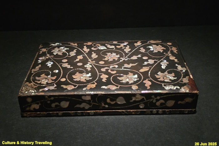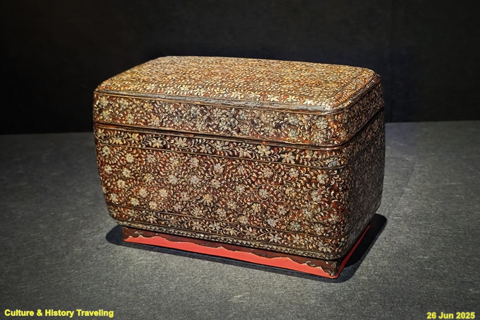 조선 전기 나전칠기는 왕실 용품이나 왕실의 하사품, 외국과 교류에서 예물로 사용되는 고급 물품이었습니다. 이 상자는 고려 나전의 전통을 기반으로 변화의 모습을 보여주는 작품입니다. 국화와 모란 넝쿨무니, 세부를 선각으로 묘사하는 모조법, 넝쿨 줄기와 경계선에 사용된 금속 등은 고려시대의 전통입니다. 그러나 고려시대에 비해 무늬의 규칙성과 밀집도가 낮아지고 넝쿨 흐름이 보다 유연해지면서 부드러운 느낌을 줍니다. 각 면의 무늬가 옆으로 연결되어 있는데 이는 조선 전기 나전칠기에 나타나는 새로운 표현 방식이기도 합니다. (안내문, 중앙박물관 특별전, 2025년)