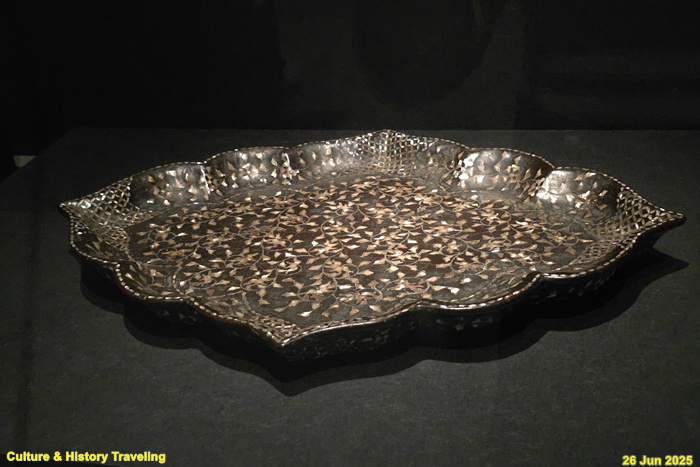 조선 전기 나전칠기의 새로운 전통을 보여주는 작품입니다. 크기가 커진 모란무늬는 활짝 핀 형태와 봉오리 형태 두 종류이며 줄기는 굵고 짧게 잘라낸 자개를 이어 붙였습니다. 이는 꽃무늬와 적절한 균형을 이룹니다. 넝쿨 잎도 굴곡진 형태로 바람에 흩날리듯 표현되었는데 보다 더 사실적인 묘사를 시도하여 새로운 전통을 만들어가는 조선 장인의 의도가 보입니다. 꽃이나 잎에는 인위적으로 균열을 낸 타찰법이 사용되었는데 이 역시 조선 전기 나전칠기의 특징 중 하나입니다. (안내문, 중앙박물관 특별전, 2025년)