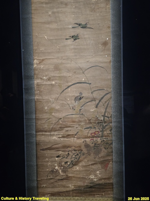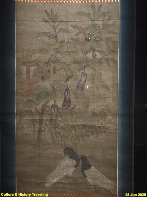 풍성하게 열린 열매 가지 아래, 두 마리 새가 나란히 앉아 있습니다. 사선 방향으로 뻗은 가지가 화면 깊숙이 배치되어 구도에 자연스러운 깊이감을 더합니다. 탐스럽게 익은 보랏빚 가지 주변에는 국화, 봉선화 등 다양한 꽃들이 어우러져 화사하고 생동감 있는 분위기를 자아냅니다. 다산과 풍요를 떠올리게 하는 열매와 꽃들은 이 그림이 단순한 자연 묘사를 넘어 길상적인 의미를 담고 있음을 알려줍니다. (안내문, 중앙박물관 특별전, 2025년)