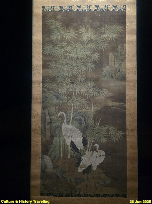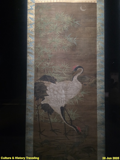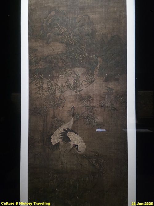 모시 두 장을 연결하여 화면을 만들고, 학과 거북, 대나무, 산과 폭포, 흰 구름이 어우러져 상서로운 분위기를 자아냅니다. 붉은 정수리와 정교한 깃털 표현이 돋보이는 학, 서기瑞氣를 내뿜는 거북의 생동감 있는 묘사, 금니를 더한 청록산수화 기법 등으로 보아 이 작품은 궁중에서 제작되었을 가능성이 큽니다. 학, 거북, 산수 등은 십장생도의 주요 소재이므로, 이 화면이 십장생도의 일부였을 가능성도 짐작할 수 있습니다. (안내문, 중앙박물관 특별전, 2025년)