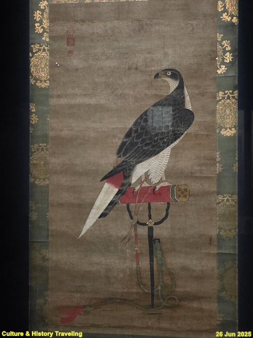 횃대 위에 매 한 마리가 앉아 있습니다. 단단한 부리, 매서운 눈, 발끝의 날카로운 발톱은 섬세한 필치로 정교하게 표현되어 있습니다. 꼬리 깃에는 ‘시치미’라 불리는 표식이 달려 있는데, 이는 주인 있는 매라는 뜻입니다. 이암은 세종의 넷째 아들 임영대군의 증손으로 특히 동물 그림에 능했던 화가입니다. 매는 예로부터 충신을 상징하는 동물로 여겨졌는데, 횃대에 묶여 있는 매는 왕에게 바른말을 하며 간신을 물리치는 신하의 상징으로 해석되기도 합니다. (안내문, 중앙박물관 특별전, 2025년)