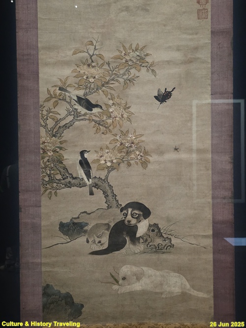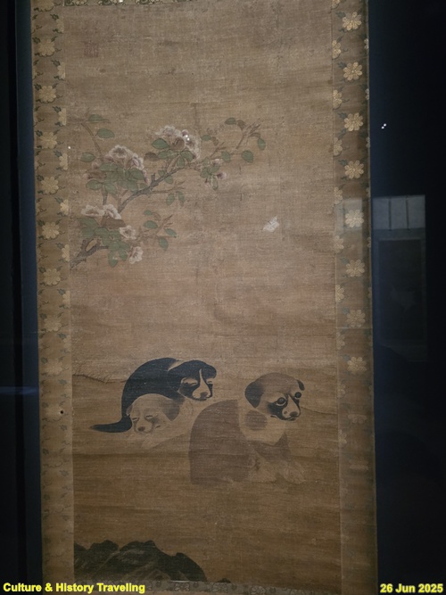 흰 꽃이 흐드러지게 핀 나뭇가지 아래, 강아지 세 마리가 쉬고 있습니다. 얼굴 아래 반점이 있는 갈색 강아지는 무언가를 응시하고, 그 뒤로 흰둥이와 검둥이는 꼭 붙어 잠들어 있습니다. 이암은 강아지의 윤곽선과 콧수염만 아주 가는 선으로 그리고, 얼굴과 몸통은 먹의 진하고 옅음을 조절해 표현하였습니다. 순하고 천진한 이암의 개 그림은 일본에도 영향을 주어, 다와라야 소타쓰, 요사 부손 등 일본 화가들이 그의 작품에서 영감을 받았습니다. (안내문, 중앙박물관 특별전, 2025년)