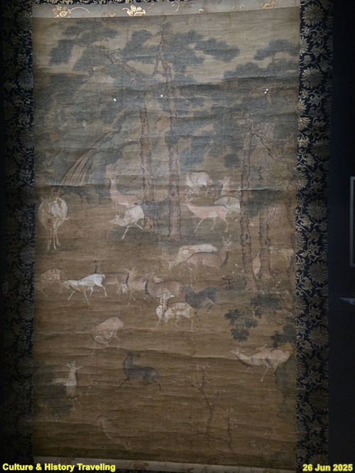 백 마리 사슴을 그린 백록도입니다. 사슴을 일컫는 한자 록鹿은 복록福感의 록終과 음이 같아 백록은 ‘많은 복’을 뜻하거나 장수를 상징합니다. 화면에는 백마리가 아닌 29마리의 사슴이 등장하여 이 작품은 백록도의 일부로 추정됩니다. 사슴들은 저마다 다른 모습으로 생동감 있게 그려져 있는데, 새끼와 함께 걷는가 하면 뿔을 맞대거나 땅의 풀을 뜯기도 합니다. 사슴의 몸 전체는 색의 농담을 조절하여 칠한 뒤, 검은 선으로 털을 한 올씩 성글게 그려 넣어 자연스러운 질감을 살렸습니다. 곳곳에 매화가 피어 있어 봄기운을 물씬 느끼게 합니다. (안내문, 중앙박물관 특별전, 2025년)