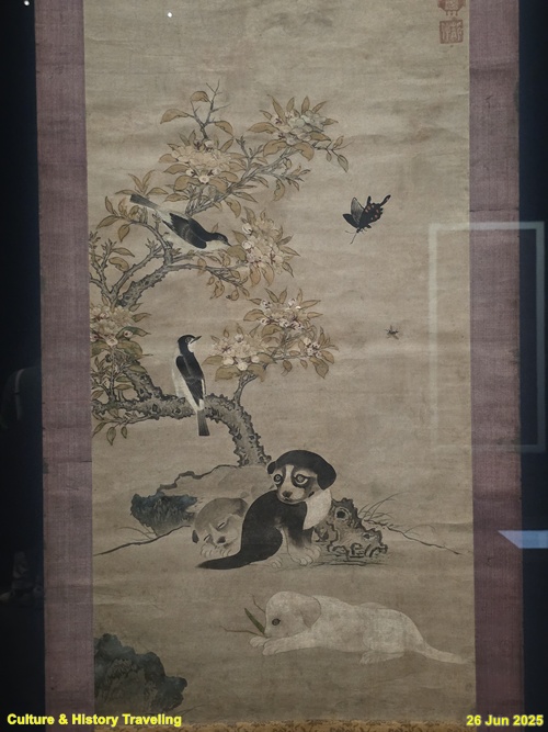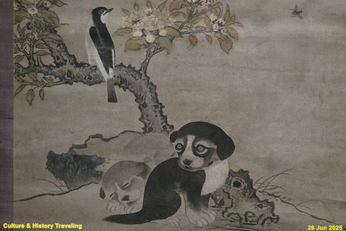 한 쌍의 새가 앉아 있는 나무 아래 강아지 세 마리가 평화롭게 쉬고 있습니다. 화면 맨 앞에 있는 강아지는 벌레를 입에 문 채 엎드려 있고, 다른 두 마리는 나무 그늘 아래에서 각각 잠을 자거나 먼 곳을 바라보며 앉아 있습니다. 강아지는 윤곽선을 쓰지 않고 먹의 진하고 옅음을 조절하여 칠했지만, 나무는 형태를 또렷하게 드러내기 위해 선으로 윤곽을 그려 넣었습니다. 또한 껍질의 울퉁불통한 질감을 살린 나무 표현은 이암의 특징적인 기법입니다. 배경을 생략하고 나무와 새, 강아지만을 그려 소재에 자연스럽게 집중하게 합니다. (중앙박물관 특별전, 2025년)