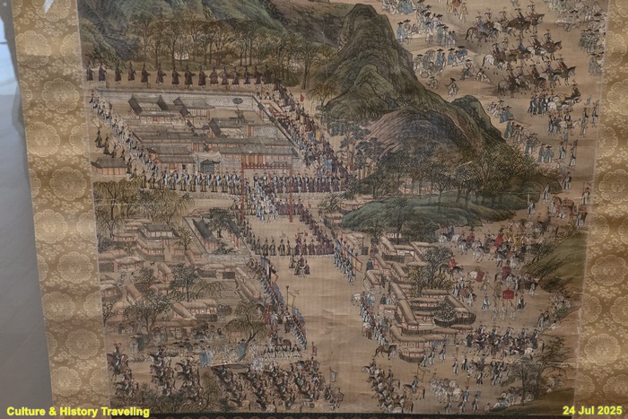 이 작품은 정조가 1795년에 어머니 혜경궁 홍씨와 함께 아버지 사도세자의 묘소를 행차하고 돌아오는 일련의 과정을 담은 8폭 병풍인 화성능행도병 중 7번째 폭이다. 김득신을 비롯하여 궁중화가들이 참여하여 완성한 작품이다. 화면구다.색채.인물 묘사 등이 매우 정교하고 규모도 크다.