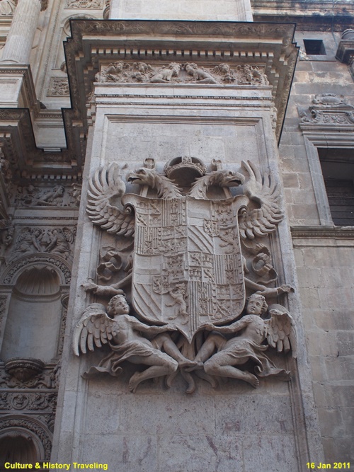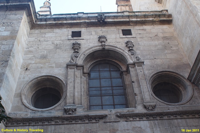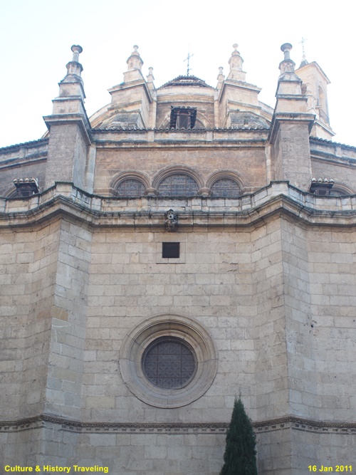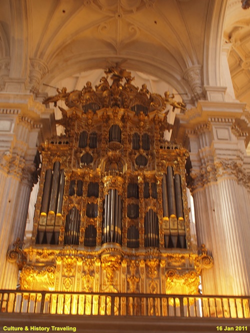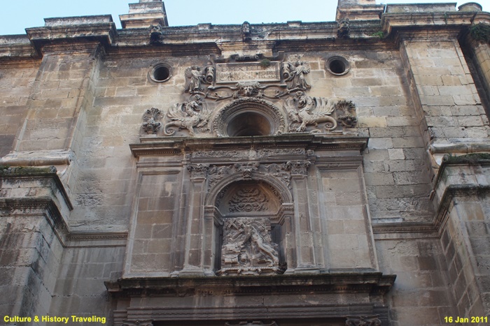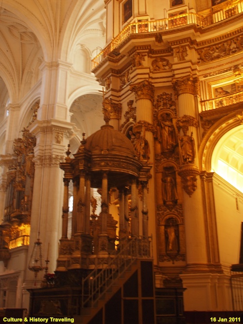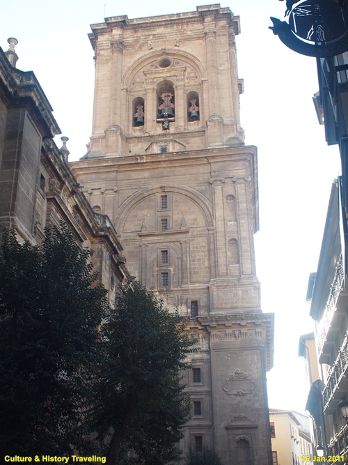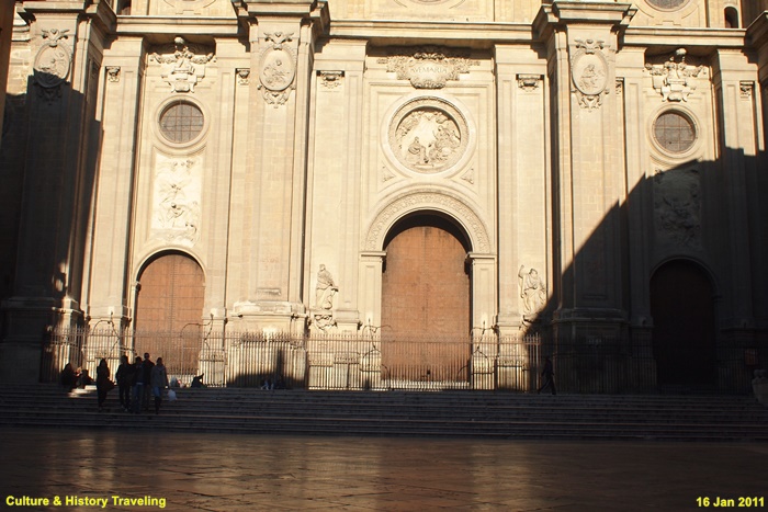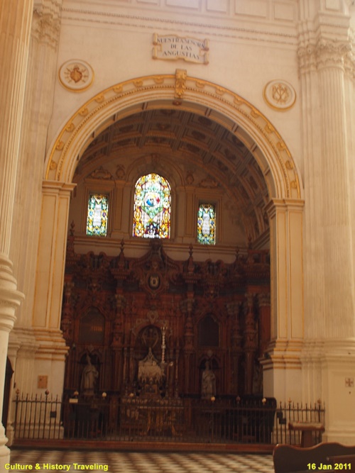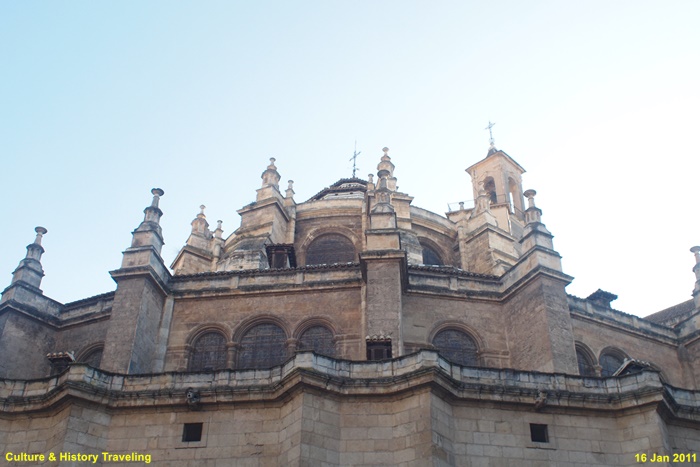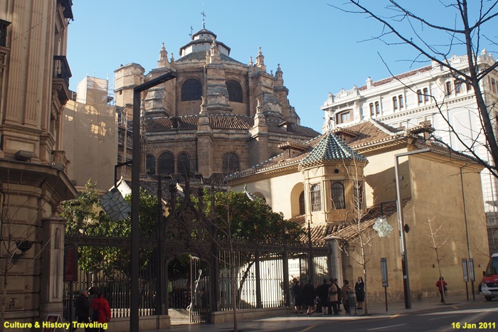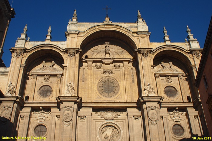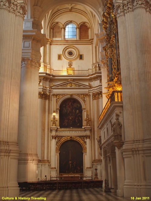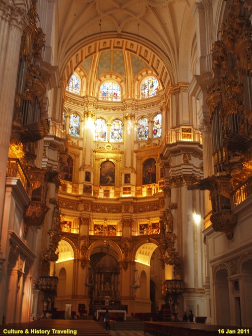 스페인 그라나다에 있는 그라나다 대성당(Catedral de Granada)이다. 스페인이 그라나다를 재정한 이후에 모스크가 있던 자리에 지어졌다. 그라나다 도심 중앙에 위치한 이 성당은 세비야나 코로도바와는 달리 기존 모스크 건축을 재활용하지는 않은 것으로 보인다. 처음에는 고딕양식으로 설계되었지만, 돔형 지붕을 비롯하여 넓은 실내공간 등 바티칸 성당에서 볼 수 있는 건축양식을 적용한 르네상스 양식이 대부분이다. 말발굽모양의 아치에서 이슬람 영향을 받은 무데하르 양식도 볼 수 있다. 돔은 푸른 바탕에 금색 별들로 장식되어 있습니다. 이 천장의 중앙 오큘러스는 꽃잎 모양으로 둘러싸여 있습니다. 돔형 천정 아래의 스테인드글라스가 아름답다. 건축적으로는 스페인 내 고딕 전통과 르네상스 인문주의의 조화를 보여준다.