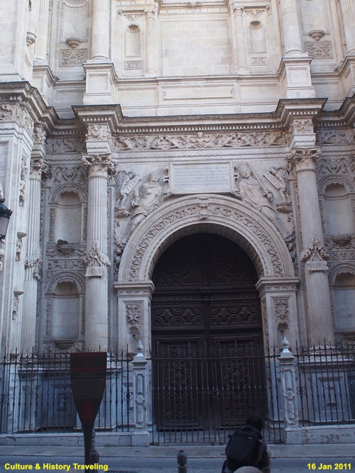그라나다 대성당의 정면 파사드는 남쪽 방향을 하고 있다. 1667년 알베르토 데 초로가 완성한 바로크식 3단 파사드이다. 거대한 반원형 아치와 원기둥, 장식 조각이 위계를 형성하며, 중심부에는 수태고지 장면이 배치되어 있다. 르네상스의 균형감 위에 바로크의 장식미가 결합된 형태이다.