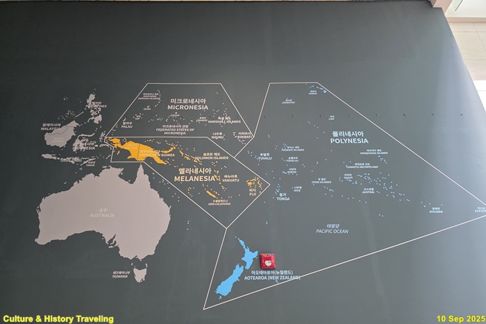 약 6만 5천 년 전, 아시아에서 건너온 이들이 바다를 지나 오세아니아에 도착했습니다. 당시 섬과 대륙은 이어져 있었고, 바다는 경계가 아닌 길이었습니다. 사람들은 별과 구름, 바람과 파도, 새의 비행과 물의 감촉으로 방향을 찾으며 항해했습니다. 기원전 2,500년경, 오스트로네시아계 민족은 쌍동선을 타고 수천 킬로미터를 항해하며 태평양 전역에 퍼졌습니다. 이주는 떠남이 아니라 바다 위에 삶을 짓는 일이 었습니다. 흩어진 섬들이 이어지고, 물과 땅이 만나는 곳에서 오세아니아라는 독특한 세계가 형성되었습니다. 바다와 육지는 신화 속에서 서로를 낚아올리고 맞서며 하나의 세계를 이루었고, 사람들은 그 위에서 문화를 이루며 살아왔습니다. 이곳은 ‘물의 영토’입니다. 바다는 흩어진 땅을 감싸며, 그 위를 건넌 이들의 감각과 기억이 쌓인 공간입니다. (안내문, 중앙박물관 특별전, 2025년)