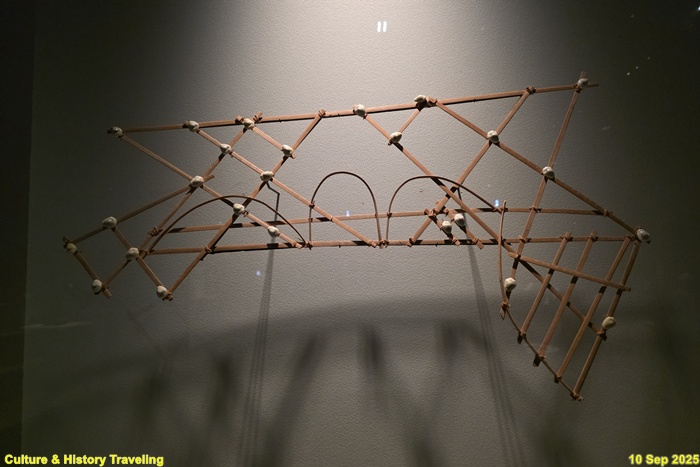 마셜 제도의 ‘리-메토(ri-meto)’는 파도와 해류로 바다를 해석하는 항해전문가입니다. 이들은 나무, 섬유, 조개껍데기 재료로 지도를 제작했습니다. 나무막대는 해류를, 조개껍데기는 섬의 위치를, 섬유 곡선은 파도의 굴절을 나타냅니다. 항해자는 출항 전 이 지도를 기억했으며, 지도는 축적된 항해 지식을 기억하고 전하는 도구였습니다. (안내문, 중앙박물관 특별전, 2025년)