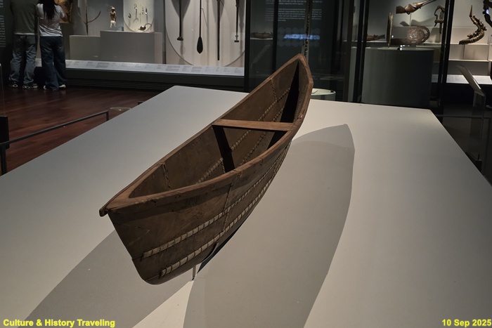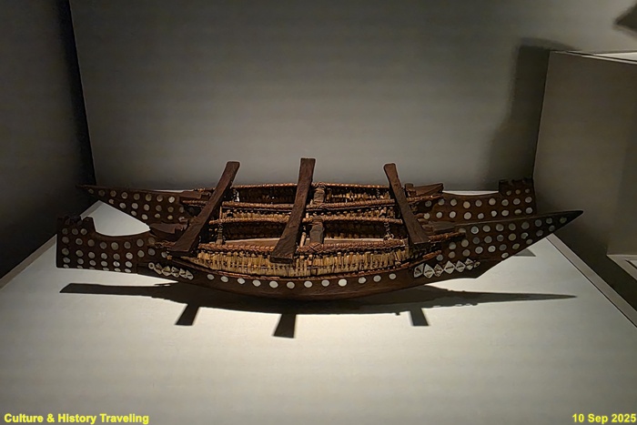 쌍동 카누인 와카 타우루아의 모형입니다. 이러한 쌍동선은 해마다 식량을 구하기 위한 항해에 사용되었습니다. 돛과 방향키, 갑판 등 세밀한 설계와 화려한 자개 장식이 돋보이며, 목재가 부족한 환경에서도 배를 만든 능숙한 기술을 엿볼 수 있습니다. 20세기 유럽인의 요청으로 제작한 카누 모형입니다. (안내문, 중앙박물관 특별전, 2025년)