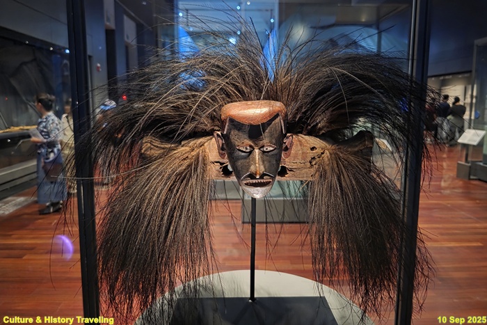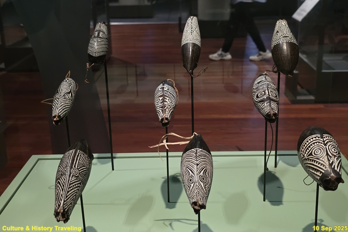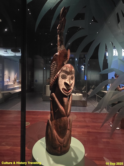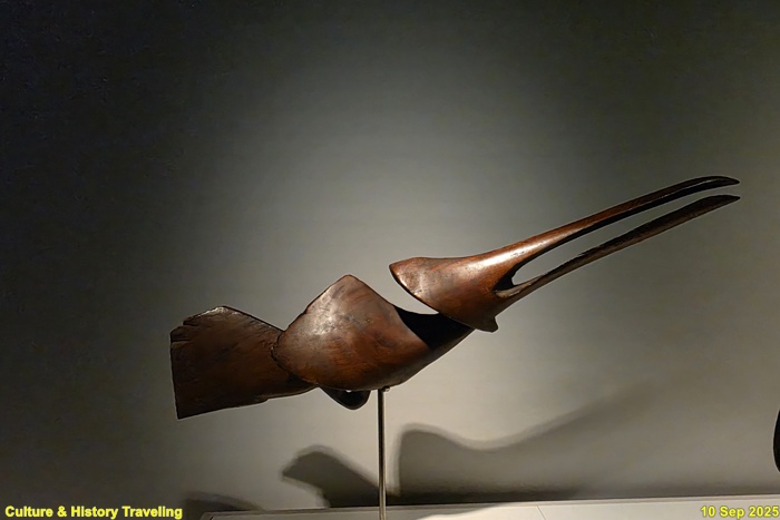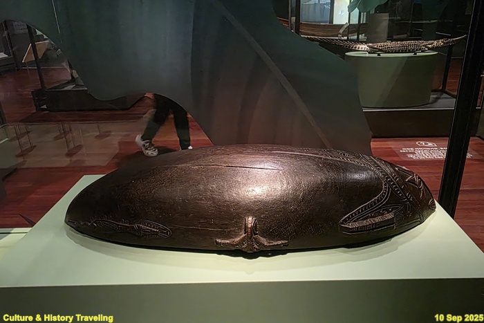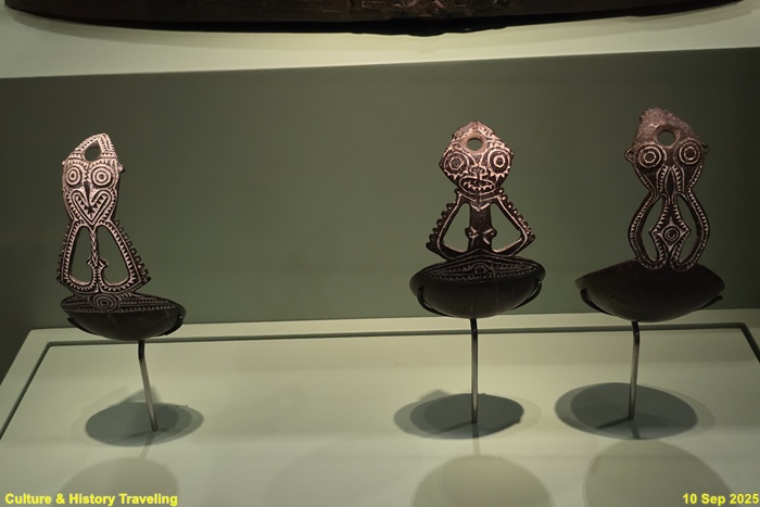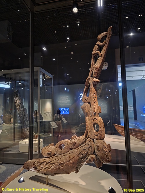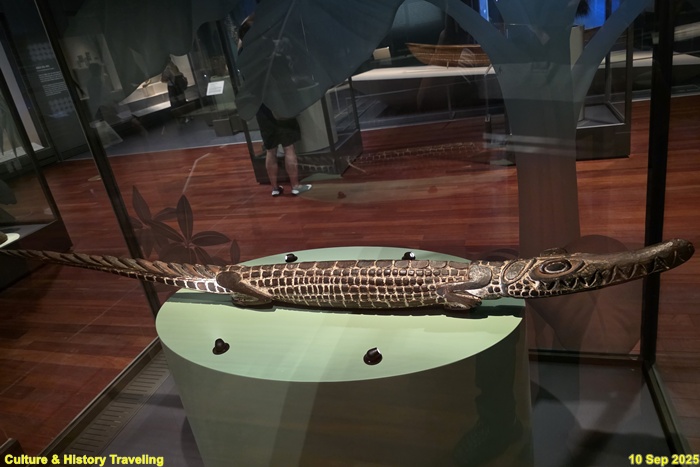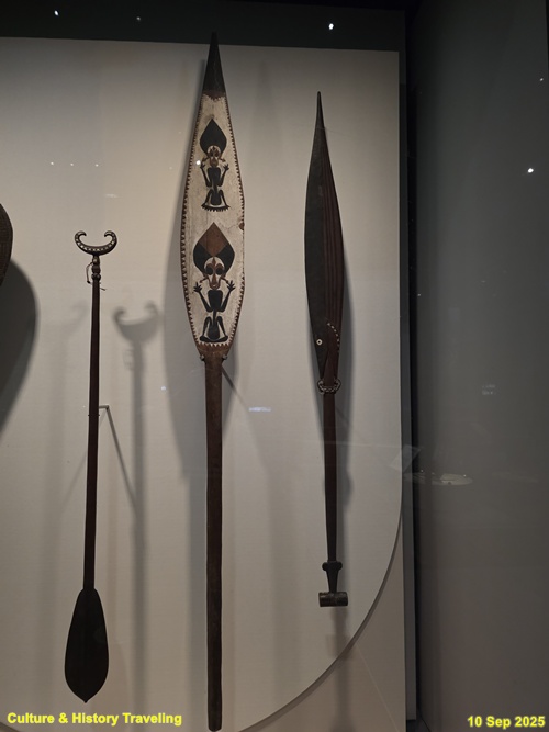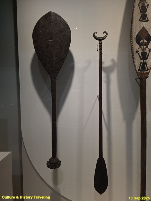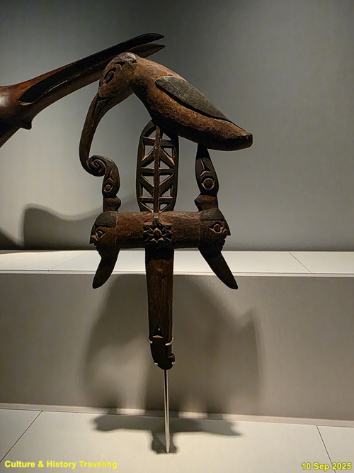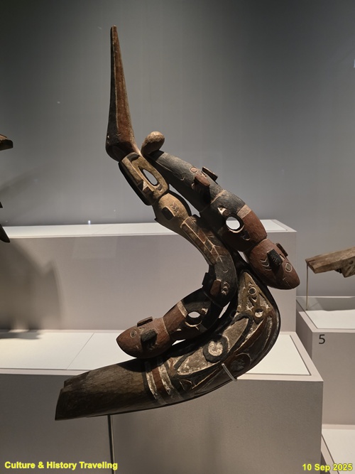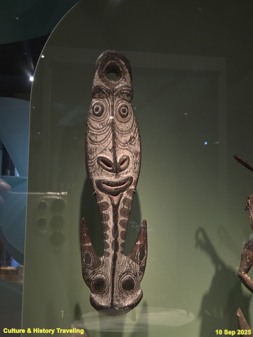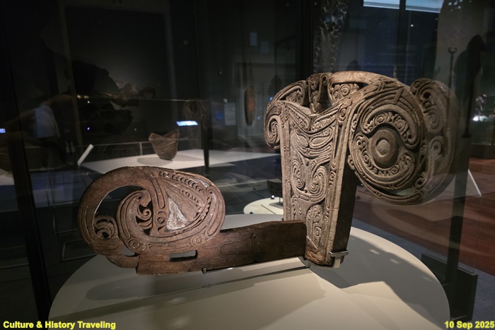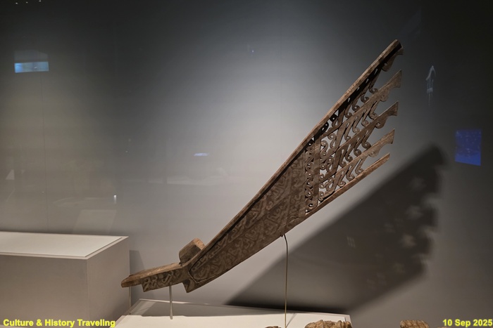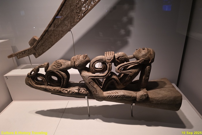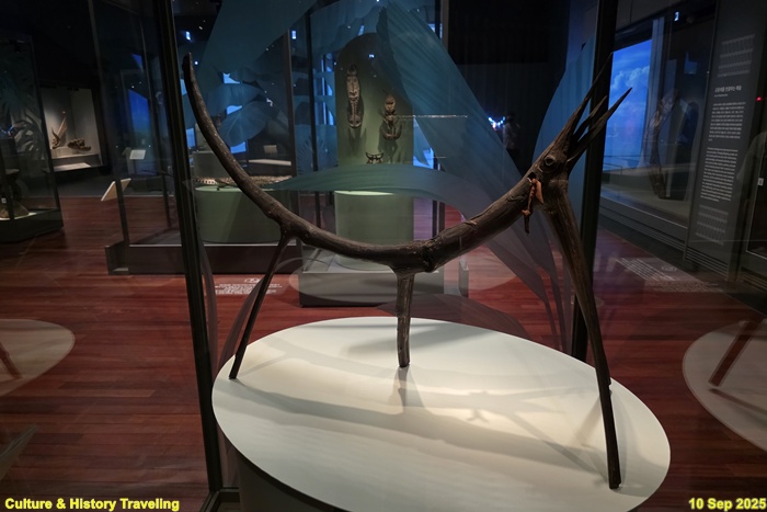 뉴기니섬 서쪽에 거주하는 오스트로네시아인 후손들은 극락조 깃털과 해삼 같은 귀한 물품으로 주변 섬은 물론 중국과도 교류했습니다. 화려한 카누에는 산호와 문어 촉수를 닮은 소용돌이 문양이 새겨져 있습니다. 바다를 지키는 정령을 상징하는 장식으로 안전한 항해를 기원 하는 의미를 담고 있습니다. (안내문, 중앙박물관 특별전, 2025년)