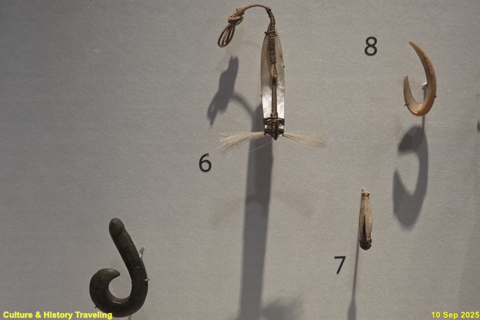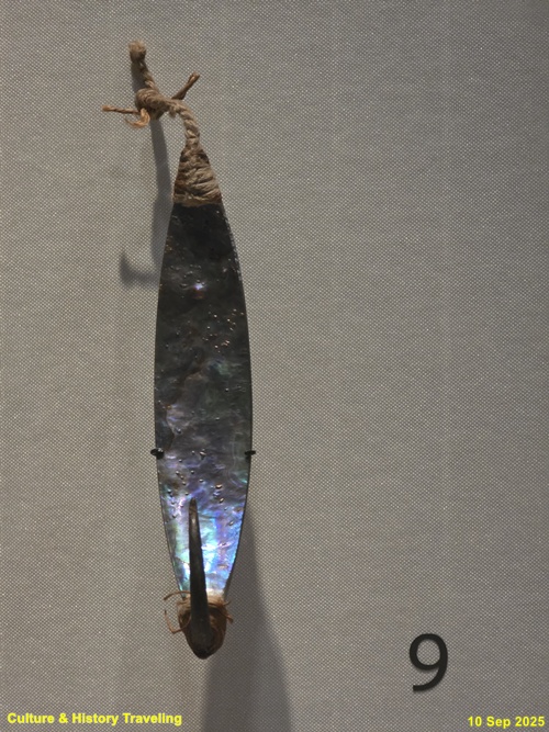 물고기 떼를 잡는 데 사용된 낚싯바늘입니다. 카누에 달린 전복 껍데기는 빛을 반사해 먹이를 유인했습니다. 마오리족 설화에서 전설 속 영웅 마우이는 마법의 낚싯바늘로 뉴질랜드 북섬을 낚아 올렸다고 전해집니다. 이 섬은 ‘아오테아로아’, 즉 ‘길고 흰 구름의 땅’이라 불리며, 남섬과 스튜어트섬은 각각 마우이의 카누와 닻에 비유됩니다. (안내문, 중앙박물관 특별전, 2025년)