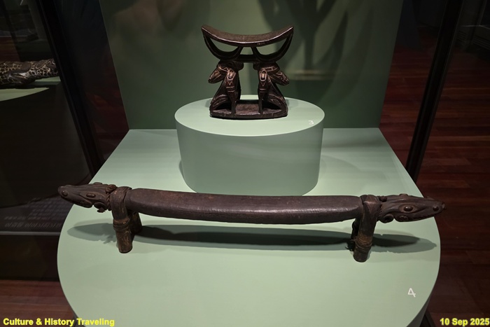 20세기 초 서양식 베개가 들어오기 전까지 사용했던 전통 목침으로 양쪽 끝에 악어 형상을 새겼습니다. 구체적으로 어떻게 사용했는지 알 수 없으나 주인은 잠자는 동안 꿈속에서 조상이라고 여겼던 악어와 특별한 관계를 맺는다고 생각했던 듯합니다. (안내문, 중앙박물관 특별전, 2025년)