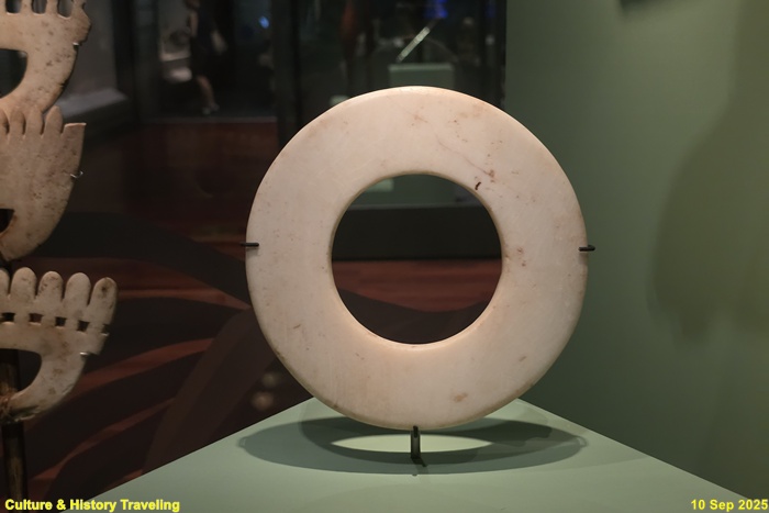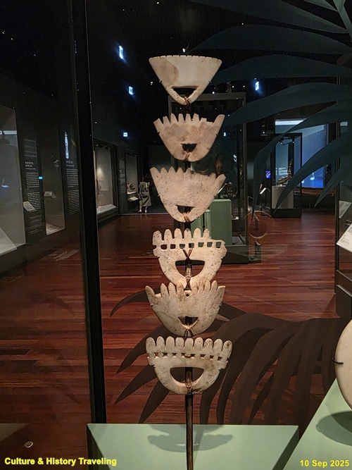 교환 화폐로도 사용된 장신구입니다. 말레이타(Malaita)섬과 마키라(Makira)섬에서는 전쟁 시 팔에 감아 적을 공격하는 무기로도 썼습니다. 솔로몬제도의 조개껍데기 팔찌는 무렵까지 거슬러 올라가는 아주 오랜 역사를 가진 장신구입니다. (안내문, 중앙박물관 특별전, 2025년)