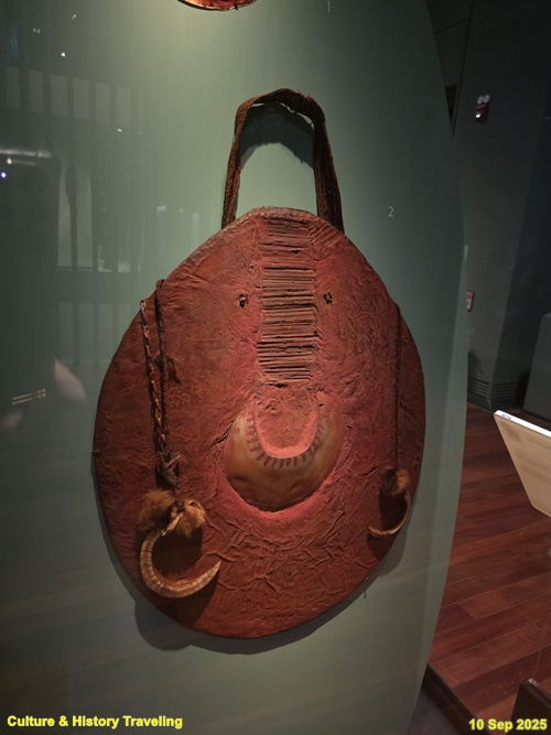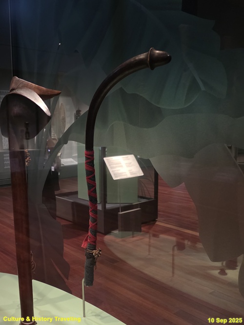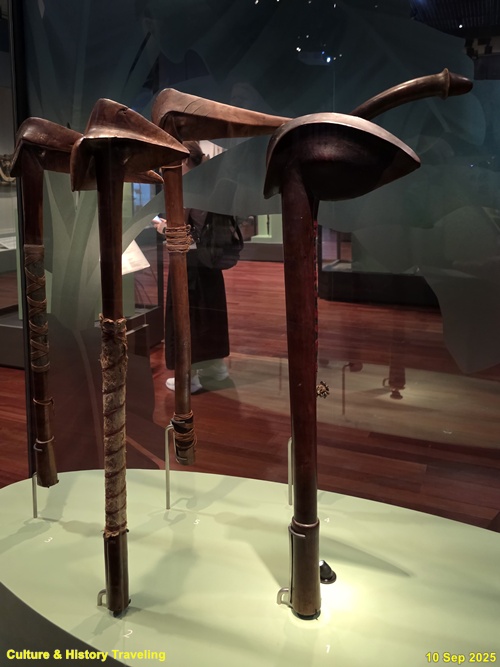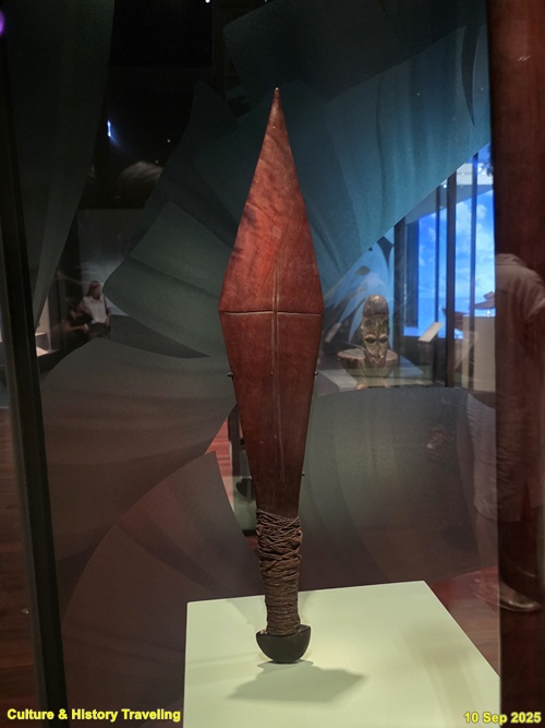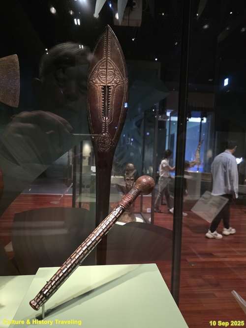 머리 사냥이나 전쟁에서 사용했던 것입니다. 중앙의 톱니 모양 구멍은 악어의 턱을 표현한 것입니다. 악어는 공격성을 상징해 머리 사냥꾼을 기리는 접시, 전쟁용 카누 장식에도 사용됩니다. 사람 얼굴과 군함조 무늬는 강한 전투 의지를 나타냅니다. 전사들은 전쟁뿐 아니라 원정을 앞두고 승리를 기원할 때도 곤봉을 사용했습니다. (안내문, 중앙박물관 특별전, 2025년)