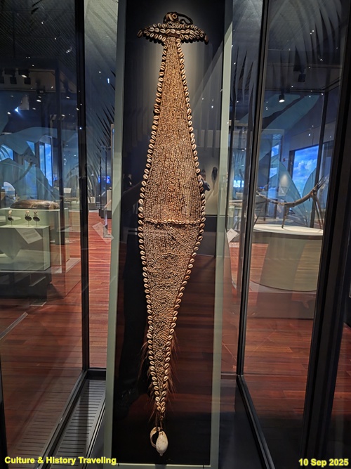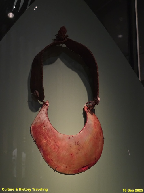 여성용 장신구로 가슴에 걸어 자신의 명예와 위신을 드러냅니다. 파푸아만 연안에서 채취되어 여러 차례 교환을 거쳐 하일랜드 지역까지 도달한 것입니다. 하일랜드에서는 승부의식, 결혼식 등에서 돼지와 교환할 정도로 중요한 장식품입니다. 교환의식은 마을 전체의 축제로 이어져 단체로 춤을 추며 아름다움을 뽐냈답니다. (안내문, 중앙박물관 특별전, 2025년)