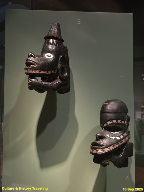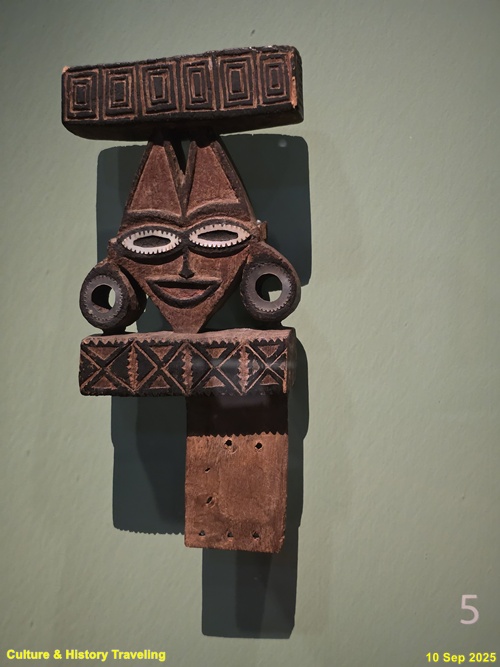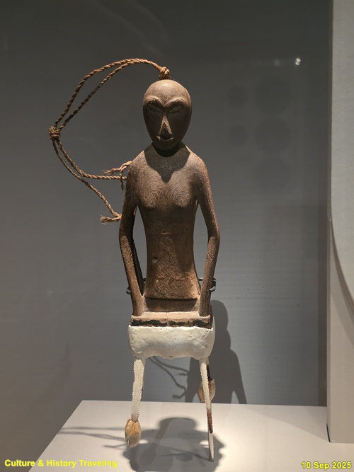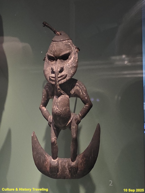 뉴기니 첸데라와시만 지역에서 샤먼과 조각가는 ‘몬’이라고 불렸으며, 그들은 씨족과 조상을 잇는 중요한 역할을 했습니다. ‘코르와르’는 죽은 자의 영혼을 상징하는 조각상으로, 큰 머리는 영혼의 힘을, 손에 든 뱀 무늬 방패는 재생과 보호를 뜻합니다. 사람들은 조상이 살아 있는 이들을 보호하고 병을 고치며, 문제를 예언한다고 믿었습니다. (안내문, 중앙박물관 특별전, 2025년)
