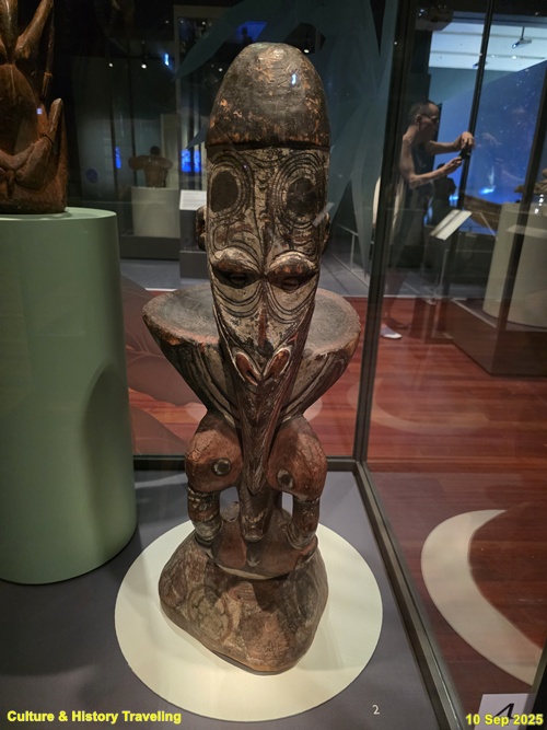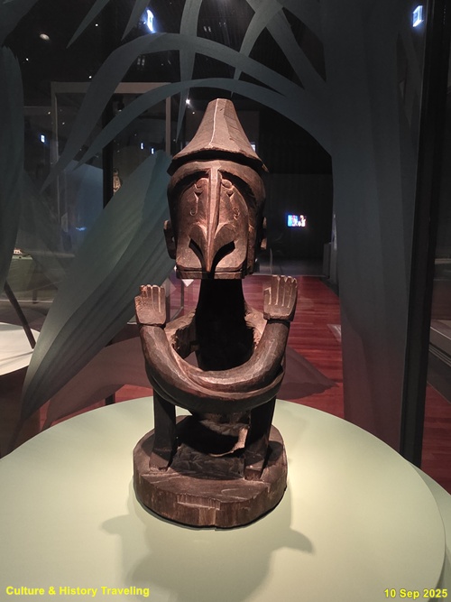 맹그로브 나무뿌리로 만든 조각상으로 자연의 형태를 그대로 살려 동물 형상을 표현했습니다. 조각가는 꿈에서 조상 영혼 ‘이무누’를 만나 특정한 나무로 안내받고, 그 나무로 조각을 만들었습니다. 조각된 파충류 형상 배의 둥근 무늬는 영혼의 통로를 뜻합니다. 이 조각상은 중요 의식 때, 조상의 영혼과 산 자를 잇는 역할을 했습니다. (안내문, 중앙박물관 특별전, 2025년)
