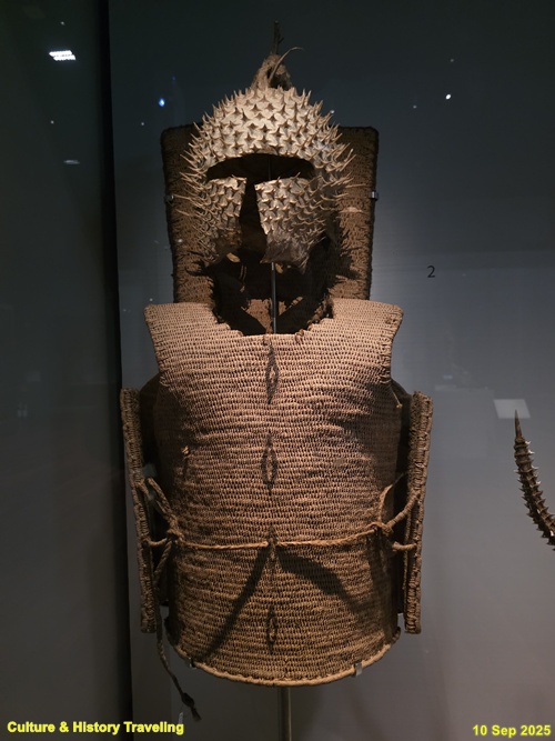 20세기 초까지 키리바시 전사들은 코코넛 섬유로 짠 갑옷을 착용했습니다. 상어 이빨 삼지창을 막을 만큼 견고했으며, 가오리 허리띠, 가시복 투구 등 다양한 바다 생물을 활용한 장비와 함께 사용했습니다. 인간과 바다, 정령의 깊은 연결을 상징하며, 특히 가시복은 조상의 화신으로 여겨졌습니다. (안내문, 중앙박물관 특별전, 2025년)