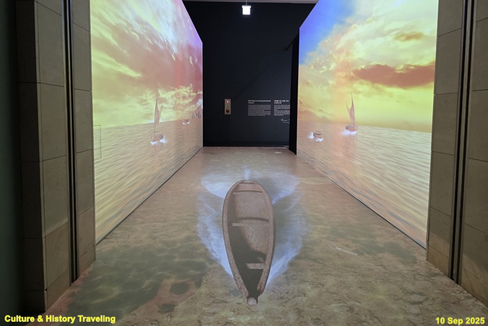 오세아니아로의 이주는 기후와 환경 변화에 따라 다양한 형태로 이루어 졌습니다. 이들은 쌍동선과 아우트리거 카누를 타고 태평양을 횡단하며 역동적인 정착사를 만들어냈습니다. 정교한 항해 기술이 담긴 선박은 외부인에게도 깊은 인상을 주었습니다. 거대한 바다 ‘모아나’는 섬과 섬을 잇고, 인간과 자연, 시간과 기억이 교차하는 하나의 세계였습니다. (안내문, 중앙박물관 특별전, 2025년)