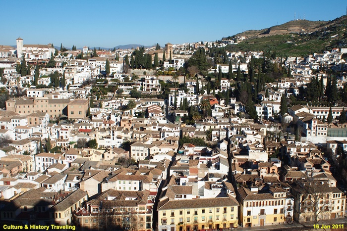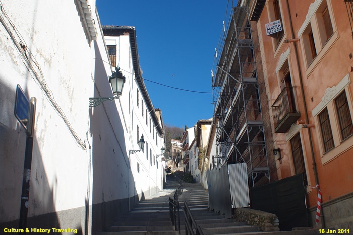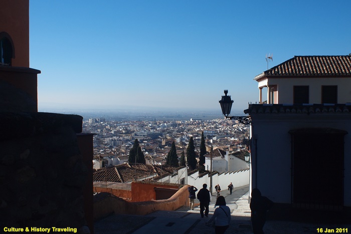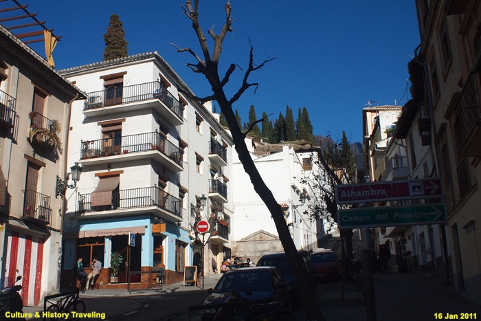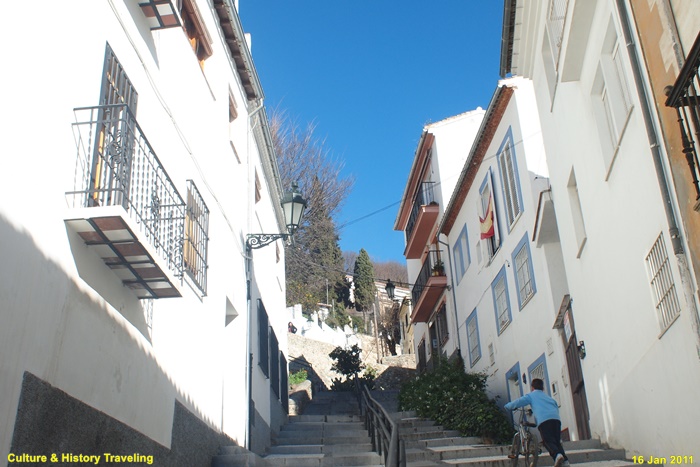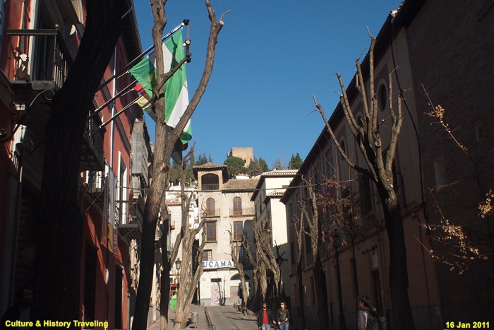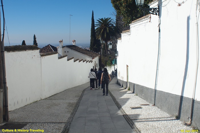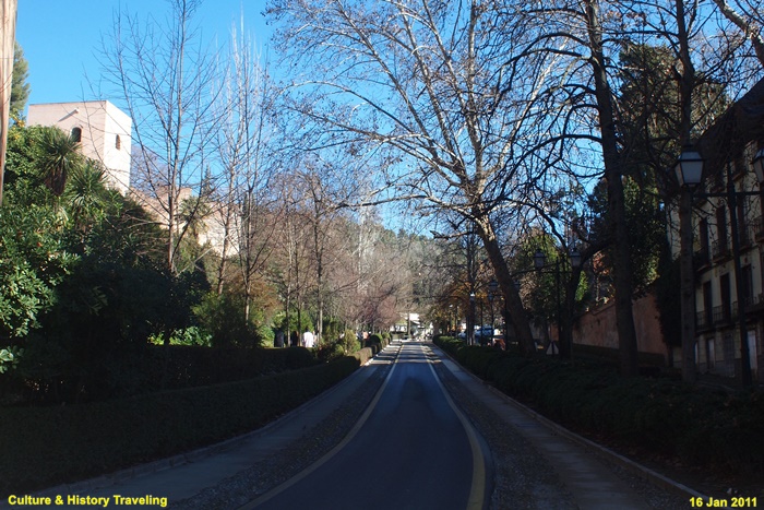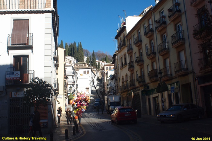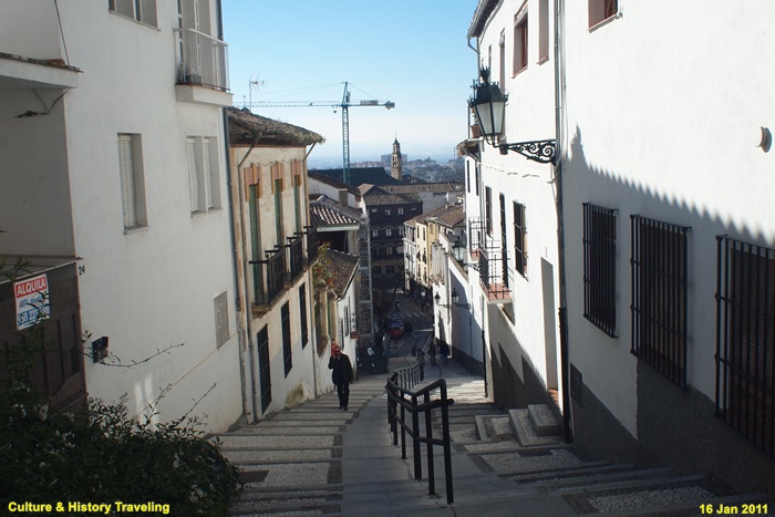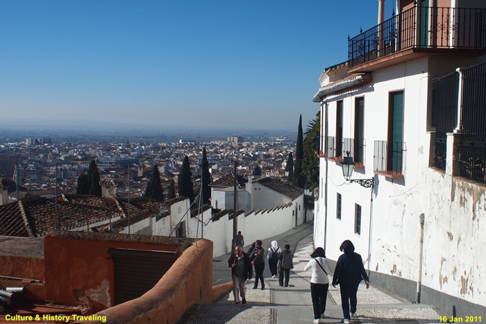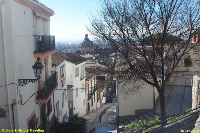 그라나다 대성당이 있는 도심에서 알함브라까지는 약 1km 정도 떨어져 있으며 걸어서 도심을 살펴보기에 좋은 길이다. 도심과 알함브리 사이는 비탈길·테라스형 골목·작은 광장이 반복되는 언덕 마을 형태이다.