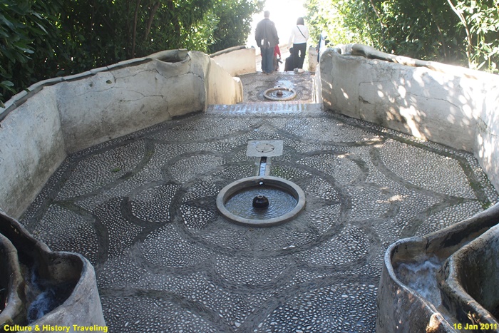 ‘술타나의 삼나무 안뜰’ 위쪽에는 유명한 ‘물 계단(Escalera del Agua)’이 있다. 이름처럼 계단을 따라 양쪽 난간에서 물이 흐르는 구조를 가진 독특한 조경 요소이다. 계단은 4단으로 이루어져 있으며, 양쪽 난간에는 물길이 조각되어 있고, 계단 꼭대기와 계단 전체를 따라 물이 흐른다. 각 층에는 작은 테라스가 있으며, 테라스 중앙에는 분수가 있다.