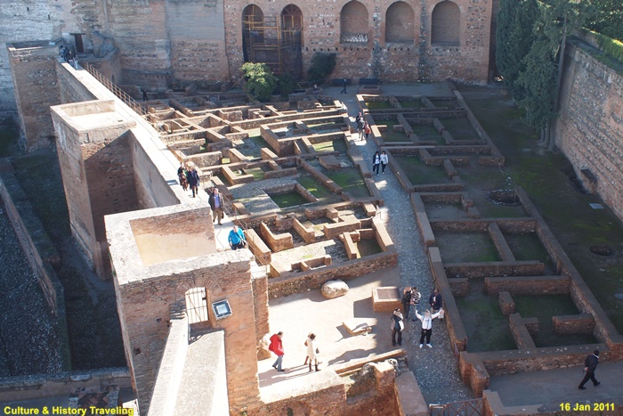 내부에는 많은 건물들이 있었던 것으로 보이며 그 흔적들이 지금도 남아 있다. 우리나라 산성과는 달리 내부는 그리 넓지 않다. 길고 좁은 거리가 이 지역의 중앙을 따라 동쪽에서 서쪽으로 이어지며 두 구역으로 나뉜다. 북쪽에는 약 10~17채의 주택들이 있었으며, 남쪽에는 창고나 편의 시설들로 보이는 건물들이 있었다. 알함브라를 지키는 경비대와 가족들이 거주했던 것으로 보인다