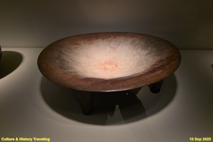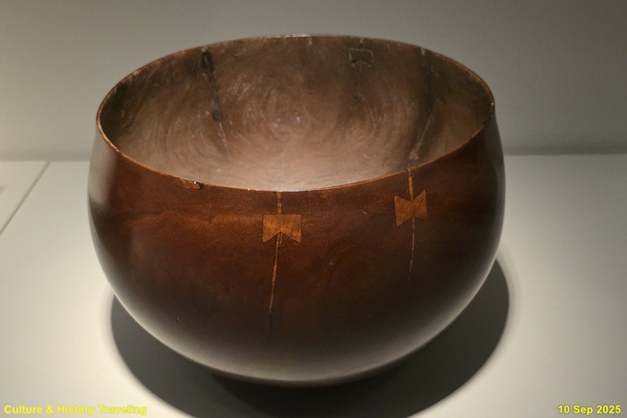 하와이의 전통 음식인 포이(poi, 타로 감자의 덩이줄기로 만든 죽)를 담는 그릇으로 의식에서 중요한 역할을 합니다. 오랜 시간에 걸쳐 표면을 다듬고 기름을 칠해 광택을 만듭니다. 이 작업은 전문 조각가와 족장 등 상류층만이 할 수 있습니다. 19세기 말에는 가보로 여겨져 대대로 물려받은 그릇을 집안에 전시했습니다. (안내문, 중앙박물관 특별전, 2025년)