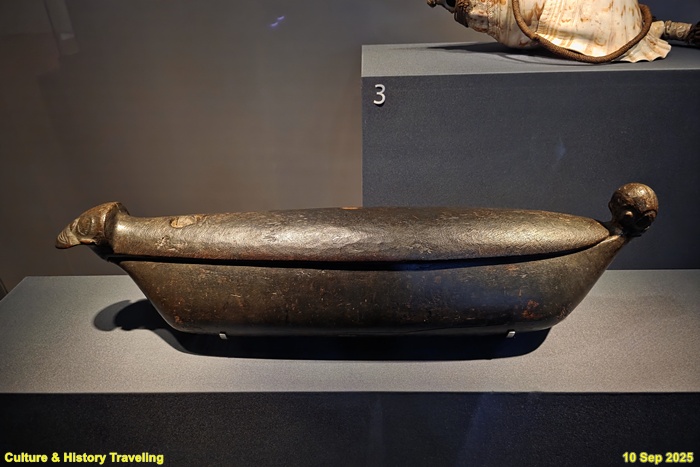 뚜껑과 용기 양쪽 끝에 하나씩 사람 얼굴을 조각했습니다. 용기 안에는 강황 염료, 으깬 빵나무 열매, 귀중품 등을 담았습니다. 족장의 머리뼈를 보관하는 신성한 용도로도 사용했습니다. 전체는 새의 형상을 본떴는데, 마르키즈 제도에서 새는 망자의 영혼을 저승으로 인도하는 존재로 여겼습니다. (안내문, 중앙박물관 특별전, 2025년)