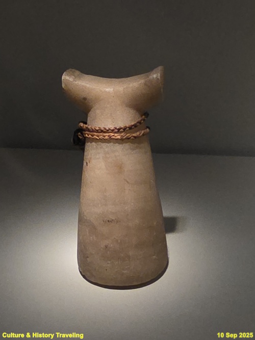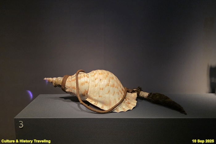 나팔은 전쟁의 시작, 아기의 탄생, 종교 의례 등 공동체의 중요한 순간을 알리는 도구였습니다. 가운데가 뚫린 원기둥 모양의 작은 조각 ‘이비 포오(ivi po’o)’ 두 개와 사람 형상의 인형이 함께 매달려 있습니다. 조각은 얼굴을 강조해 새겼는데, 폴리네시아에서 머리는 타푸(tapu), 즉 신성함을 가진 보호의 영역으로 여겼습니다. (안내문, 중앙박물관 특별전, 2025년)